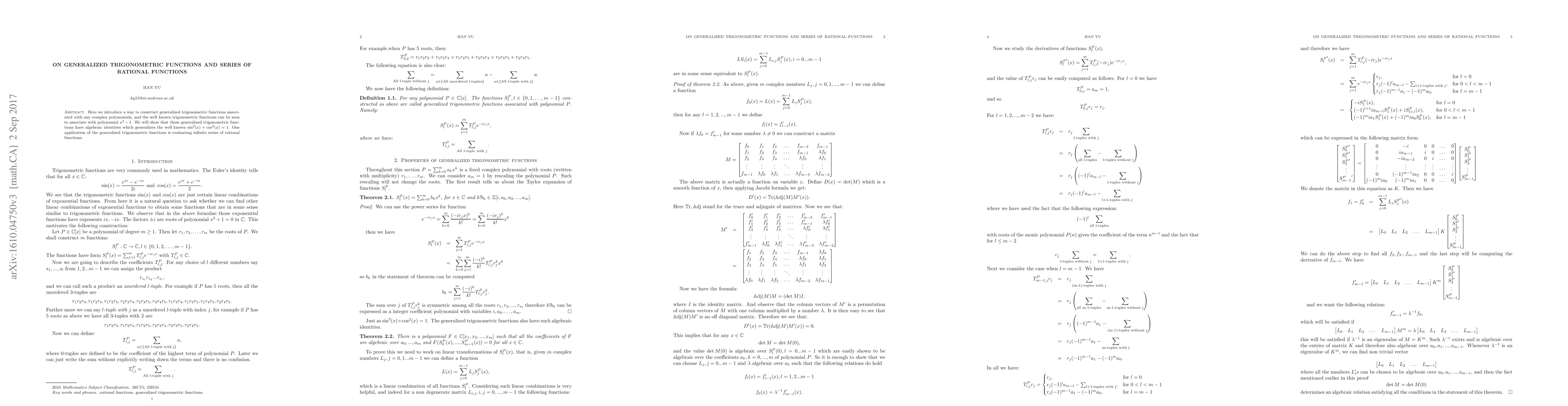 This paper introduces generalized trigonometric functions linked to any complex polynomial, demonstrating algebraic identities that generalize the Pythagorean identity. It also applies these functions to evaluate infinite series of rational functions.