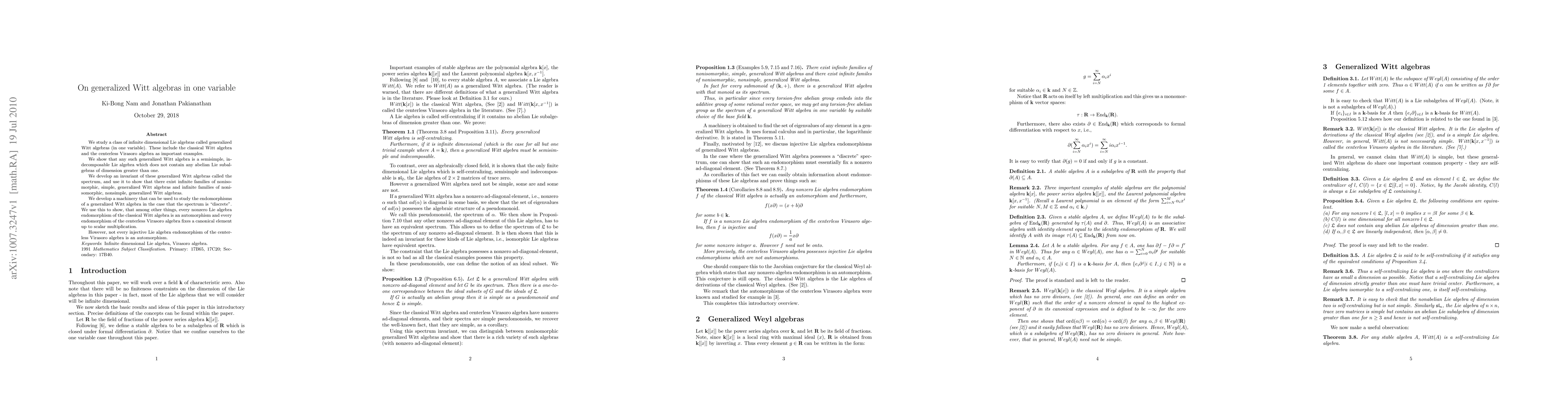 This paper investigates generalized Witt algebras in one variable, demonstrating they are semisimple and indecomposable, and introduces a spectrum invariant to classify infinite families of simple and nonsimple algebras. It also reveals that classical Witt algebra endomorphisms are automorphisms, while Virasoro algebra endomorphisms may not be, despite fixing a canonical element.