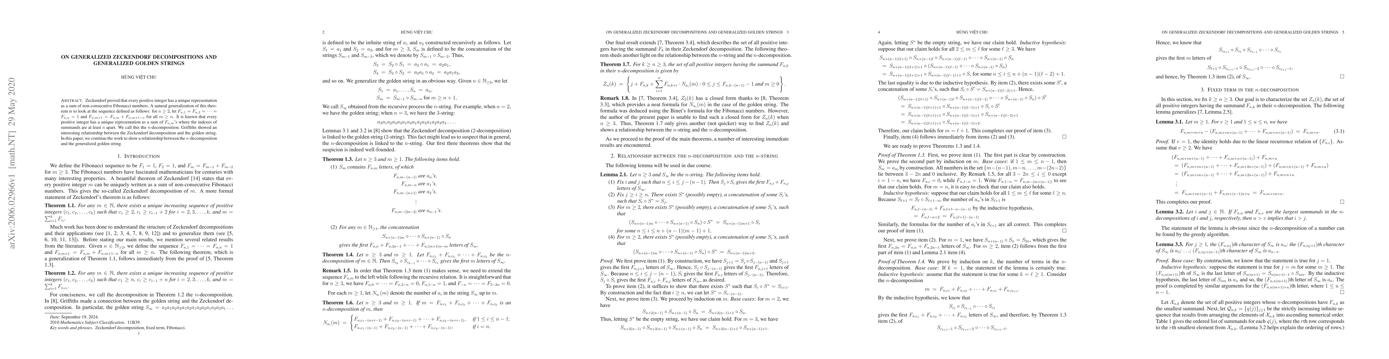 This paper explores generalized Zeckendorf decompositions using a sequence of Fibonacci-like numbers, proving unique representations of integers as sums of these numbers with at least $n$ apart indices. It further investigates the connection between these decompositions and generalized golden strings.