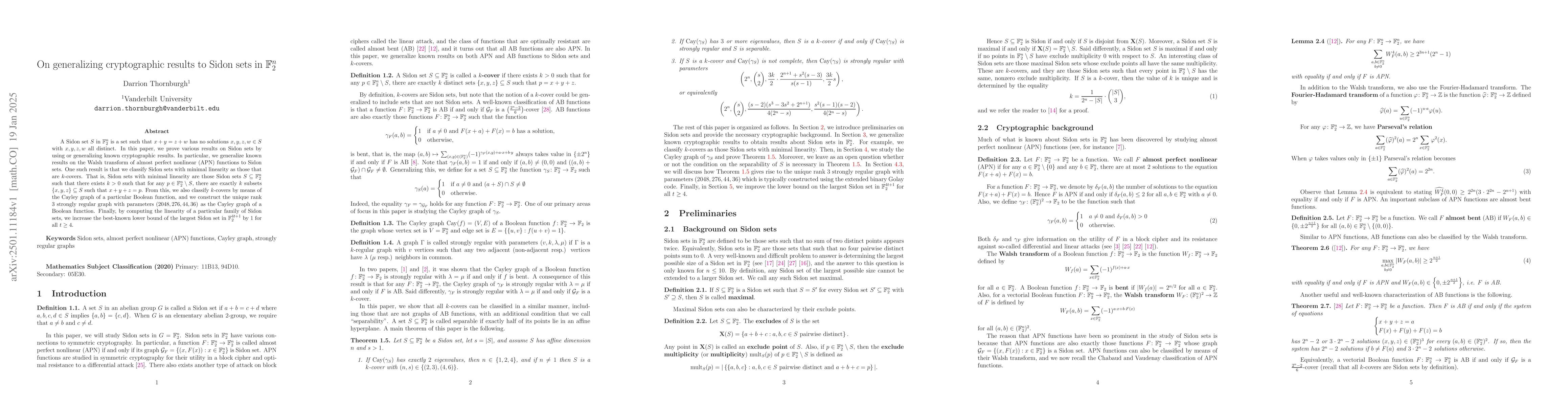 This paper generalizes cryptographic results to Sidon sets in $\mathbb{F}_2^n$, proving that Sidon sets with minimal linearity are $k$-covers, and constructs a unique rank $3$ strongly regular graph. It also raises the lower bound for the largest Sidon set in $\mathbb{F}_2^{4t+1}$ by 1 for $t \geq 4$.