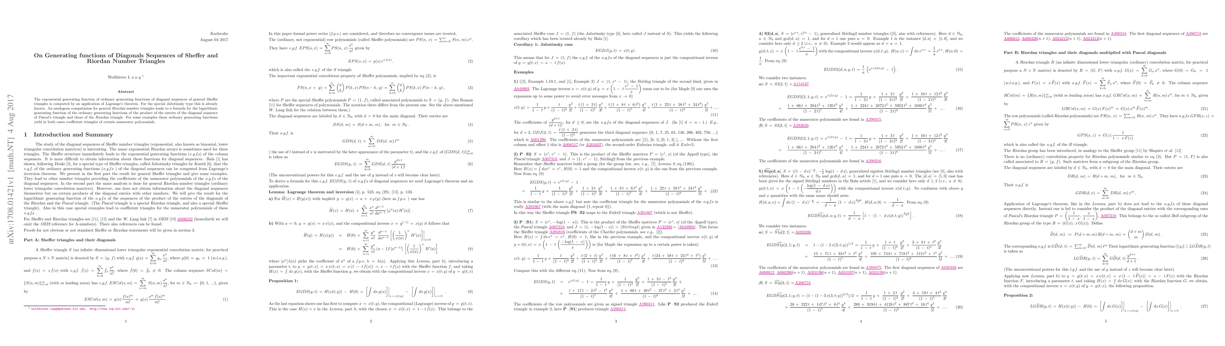 Researchers computed exponential generating functions for diagonal sequences of general Sheffer triangles and Riordan number triangles, finding connections to coefficient triangles and a formula for logarithmic generating functions.