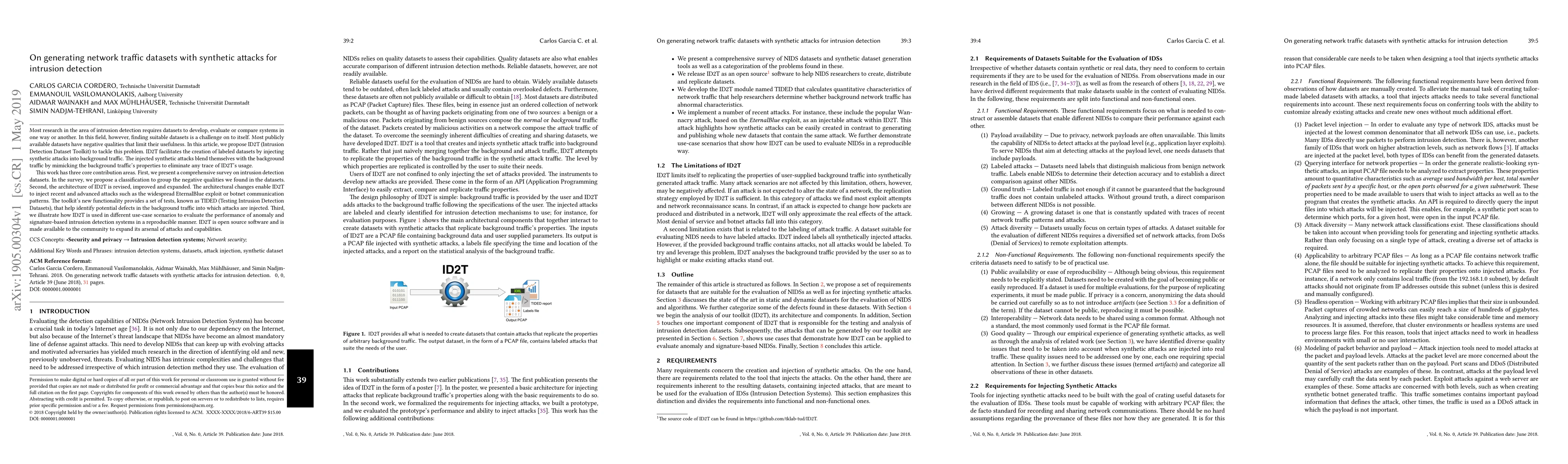 This paper introduces ID2T, a toolkit for generating network traffic datasets with synthetic attacks to improve intrusion detection research. It surveys existing datasets, enhances the toolkit's architecture to include advanced attacks, and provides a method to test dataset quality, aiming to create more reliable and usable datasets for evaluating intrusion detection systems.