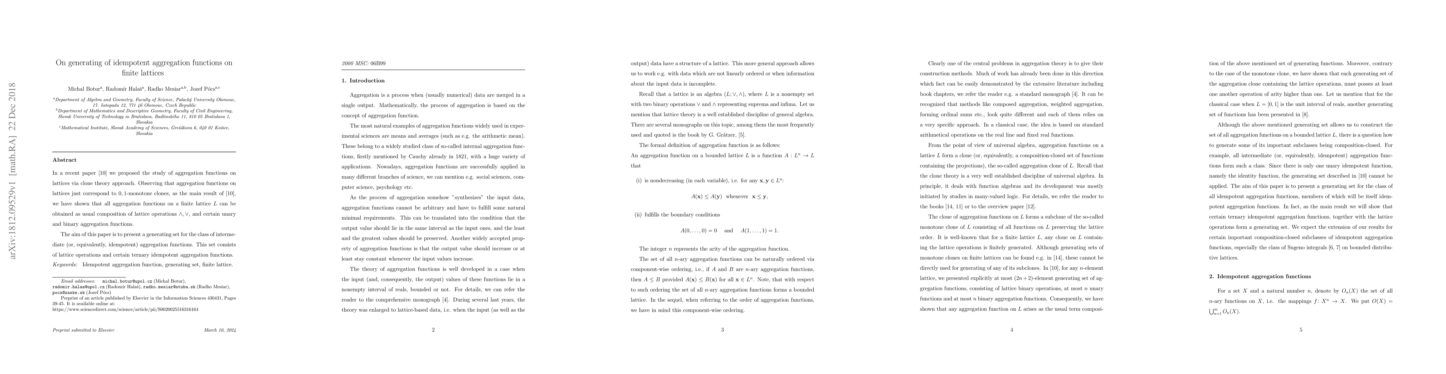 This paper explores the generation of idempotent aggregation functions on finite lattices using clone theory. It identifies a generating set comprising lattice operations and specific ternary idempotent functions to produce all intermediate aggregation functions.