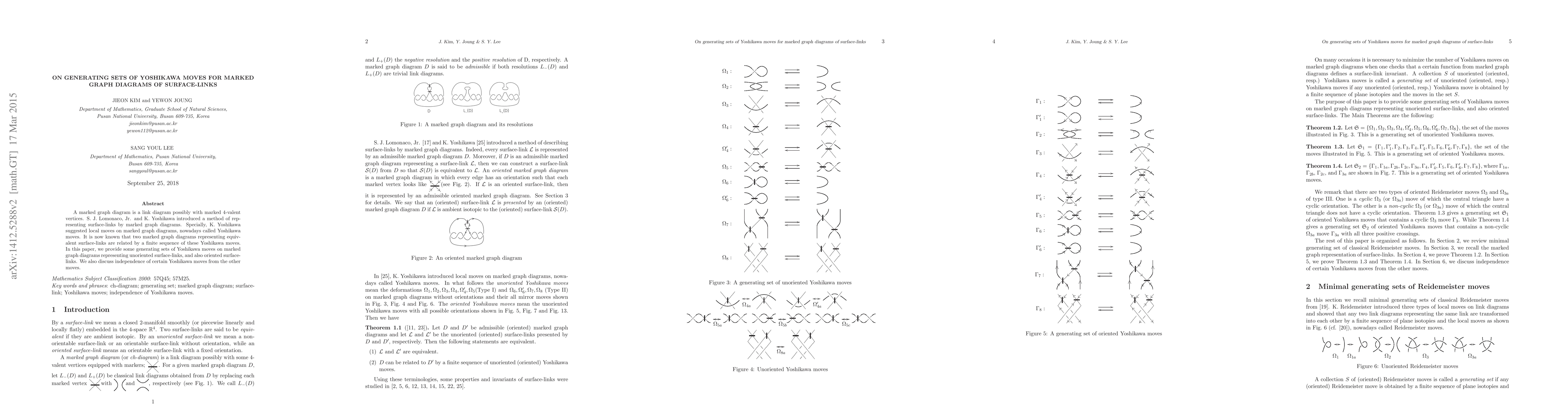 A marked graph diagram is a link diagram possibly with marked $4$-valent vertices. S. J. Lomonaco, Jr. and K. Yoshikawa introduced a method of representing surface-links by marked graph diagrams. Specially, K. Yoshikawa gave local moves on marked graph diagrams, nowadays called Yoshikawa moves. It is now known that two marked graph diagrams representing equivalent surface-links are related by a finite sequence of these Yoshikawa moves. In this paper, we provide some generating sets of Yoshikawa moves on marked graph diagrams representing unoriented surface-links, and also oriented surface-links. We also discuss independence of certain Yoshikawa moves from the other moves.
