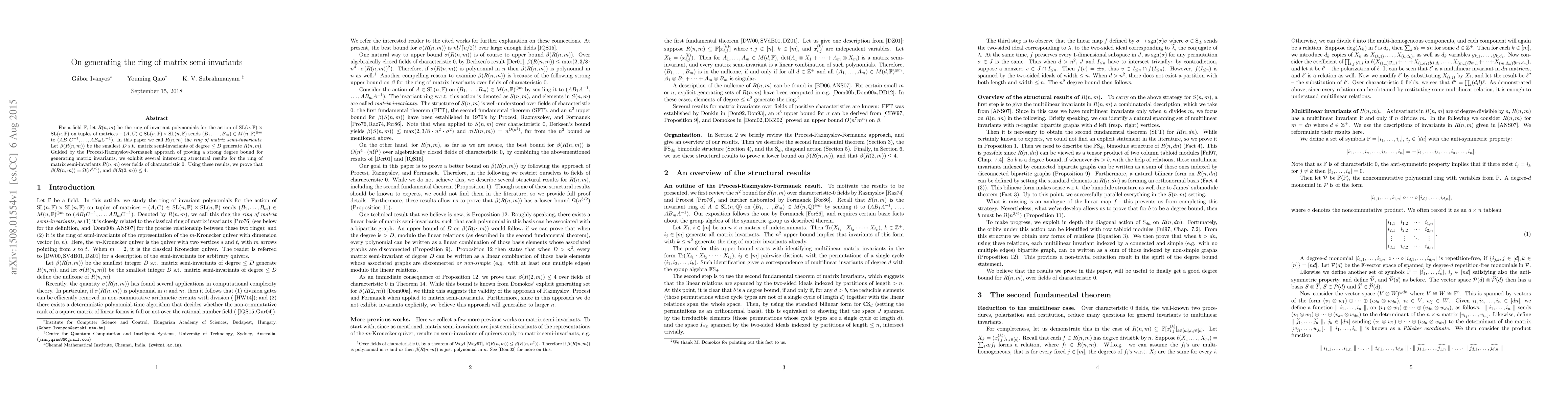 This paper investigates the ring of matrix semi-invariants $R(n, m)$ under the action of $\mathrm{SL}(n, \mathbb{F}) \times \mathrm{SL}(n, \mathbb{F})$, proving structural results for this ring over fields of characteristic $0$. It establishes that the smallest degree generating the ring is $\beta(R(n, m))=\Omega(n^{3/2})$ and $\beta(R(2, m))\leq 4$.