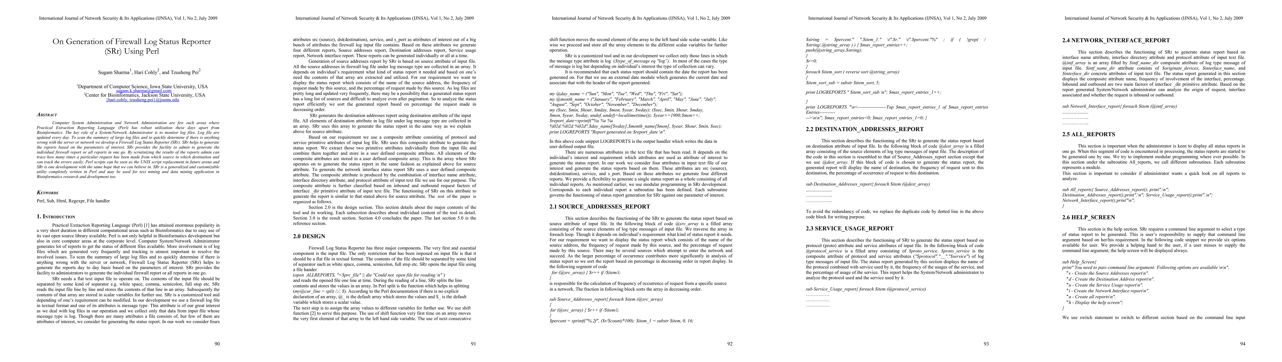 Computer System Administration and Network Administration are few such areas where Practical Extraction Reporting Language (Perl) has robust utilization these days apart from Bioinformatics. The key role of a System/Network Administrator is to monitor log files. Log file are updated every day. To scan the summary of large log files and to quickly determine if there is anything wrong with the server or network we develop a Firewall Log Status Reporter (SRr). SRr helps to generate the reports based on the parameters of interest. SRr provides the facility to admin to generate the individual firewall report or all reports in one go. By scrutinizing the results of the reports admin can trace how many times a particular request has been made from which source to which destination and can track the errors easily. Perl scripts can be seen as the UNIX script replacement in future arena and SRr is one development with the same hope that we can believe in. SRr is a generalized and customizable utility completely written in Perl and may be used for text mining and data mining application in Bioinformatics research and development too.