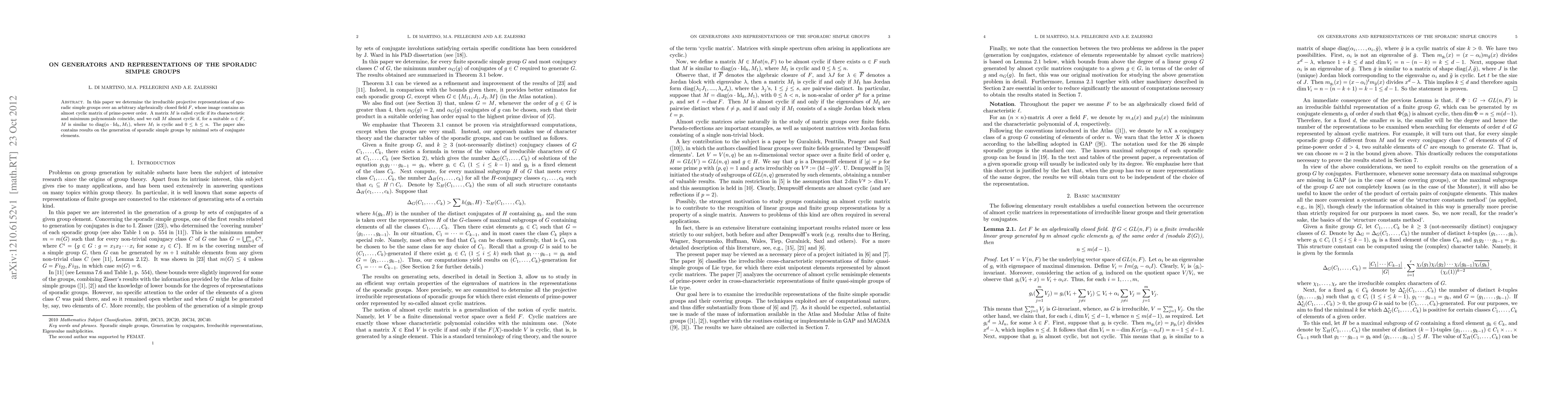 This paper explores the irreducible projective representations of sporadic simple groups over an arbitrary algebraically closed field, focusing on those containing almost cyclic matrices, and also investigates the generation of these groups by minimal sets of conjugate elements.