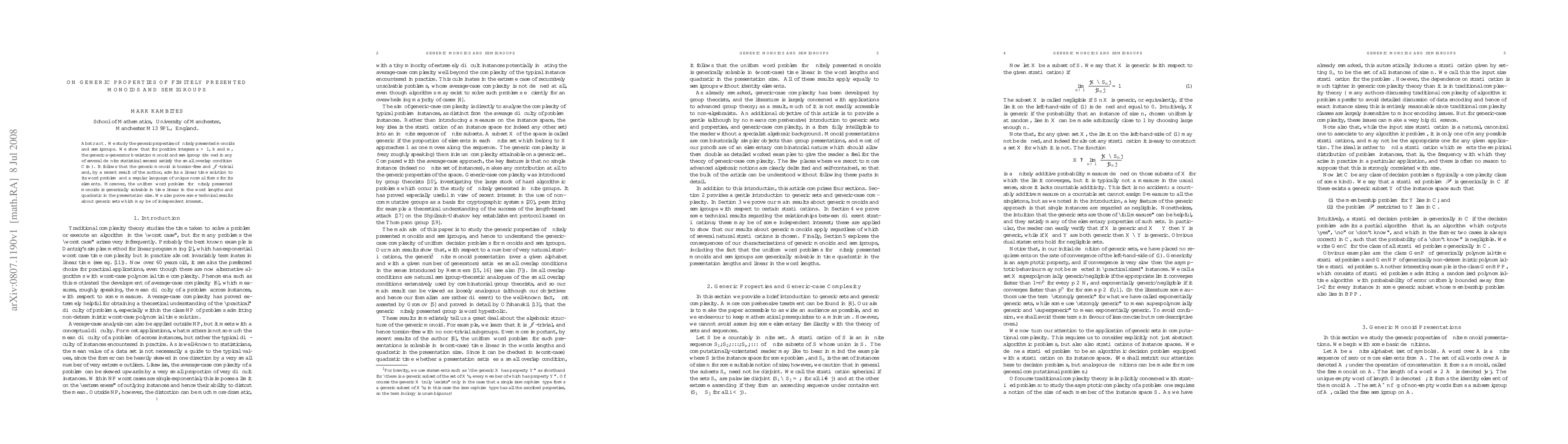 This paper investigates the generic properties of finitely presented monoids and semigroups, demonstrating that the generic a-generator k-relation monoid and semigroup satisfy the small overlap condition C(m). It concludes that the generic monoid is torsion-free, J-trivial, and has a linear time word problem solution and a regular language of unique normal forms.