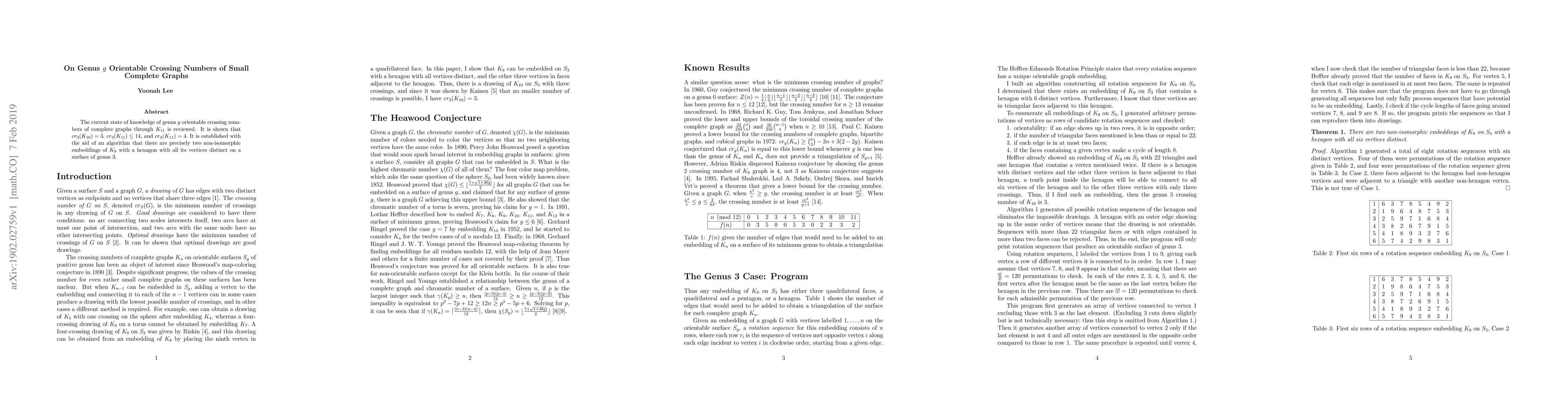 Researchers studied genus g orientable crossing numbers of small complete graphs up to K11, finding specific values for cr3(K10), cr3(K11), and the number of non-isomorphic embeddings of K9 on a surface of genus 3.