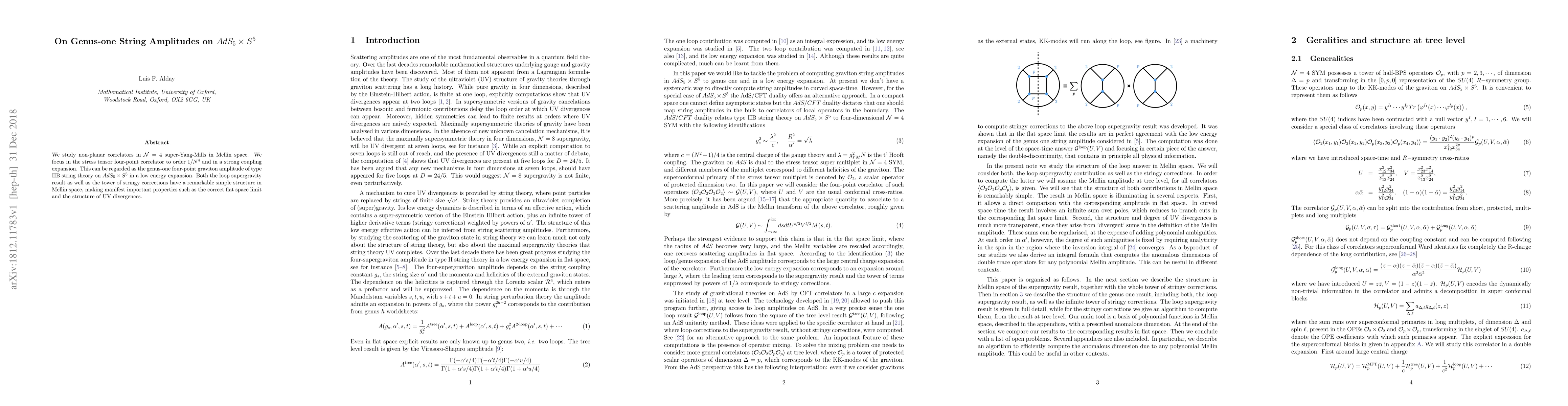 This paper examines non-planar correlators in ${\cal N}=4$ super-Yang-Mills theory, specifically the four-point stress tensor correlator to $1/N^4$ order and within a strong coupling expansion. It identifies this correlator as the genus-one graviton amplitude in type IIB string theory on $AdS_5 \times S^5$, revealing a simple structure in Mellin space that highlights essential properties like the flat space limit and UV divergence structure.