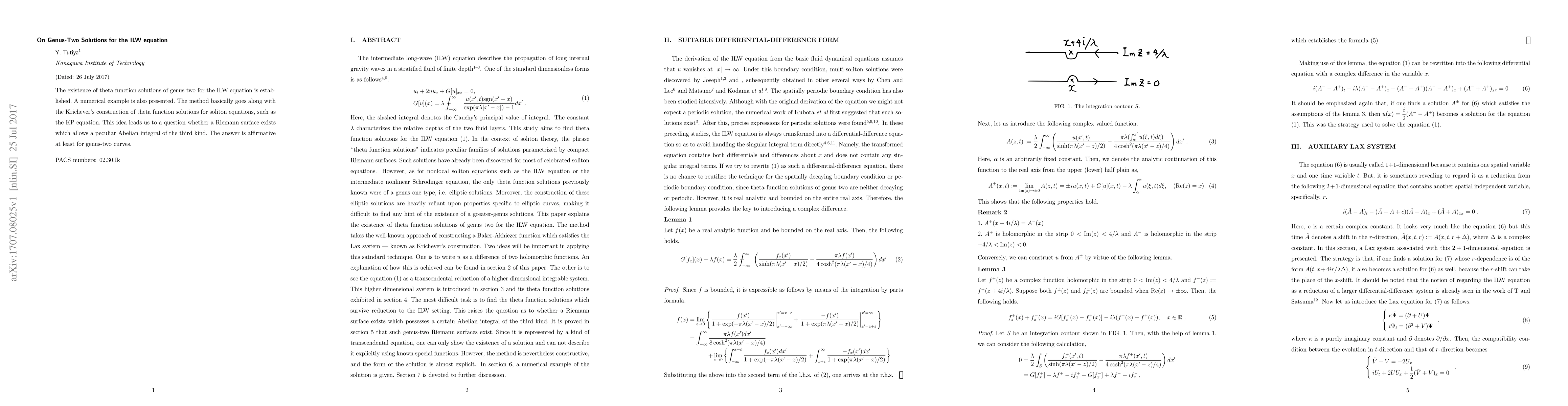 The existence of theta function solutions of genus two for the ILW equation is established. A numerical example is also presented. The method basically goes along with the Krichever's construction of theta function solutions for soliton equations, such as the KP equation. This idea leads us to a question whether a Riemann surface exists which allows a peculiar Abelian integral of the third kind. The answer is affirmative at least for genus-two curves.