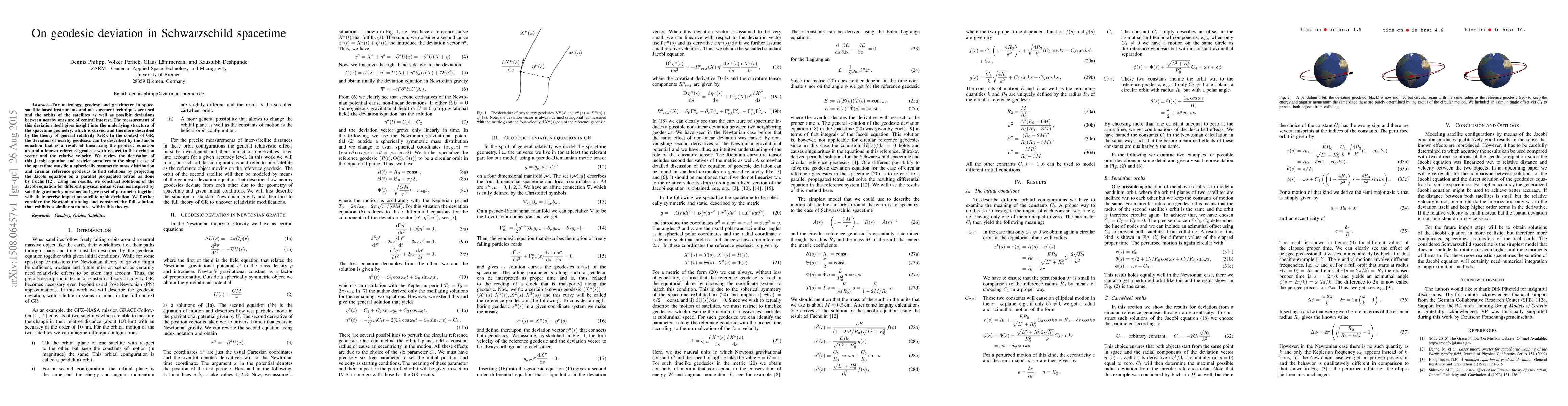 This paper reviews the derivation of the Jacobi equation for geodesic deviation in Schwarzschild spacetime, focusing on circular reference geodesics. It provides solutions relevant to satellite gravimetry, detailing the impact of parameters on satellite orbit deviations and comparing the results to Newtonian analogs.