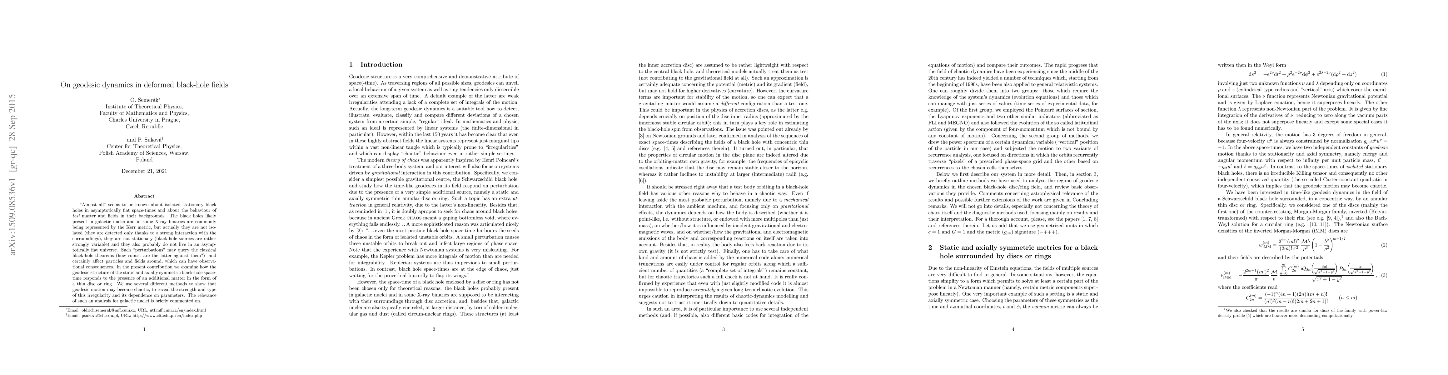 "Almost all" seems to be known about isolated stationary black holes in asymptotically flat space-times and about the behaviour of {\em test} matter and fields in their backgrounds. The black holes likely present in galactic nuclei and in some X-ray binaries are commonly being represented by the Kerr metric, but actually they are not isolated (they are detected only thanks to a strong interaction with the surroundings), they are not stationary (black-hole sources are rather strongly variable) and they also probably do not live in an asymptotically flat universe. Such "perturbations" may query the classical black-hole theorems (how robust are the latter against them?) and certainly affect particles and fields around, which can have observational consequences. In the present contribution we examine how the geodesic structure of the static and axially symmetric black-hole space-time responds to the presence of an additional matter in the form of a thin disc or ring. We use several different methods to show that geodesic motion may become chaotic, to reveal the strength and type of this irregularity and its dependence on parameters. The relevance of such an analysis for galactic nuclei is briefly commented on.