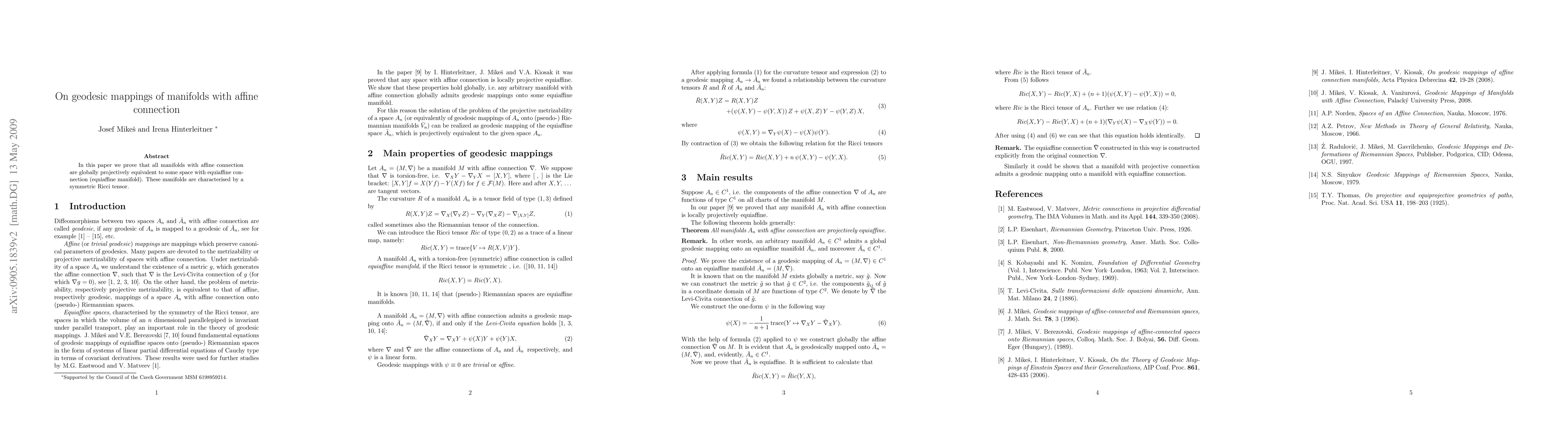 In this paper we prove that all manifolds with affine connection are globally projectively equivalent to some space with equiaffine connection (equiaffine manifold). These manifolds are characterised by a symmetric Ricci tensor.