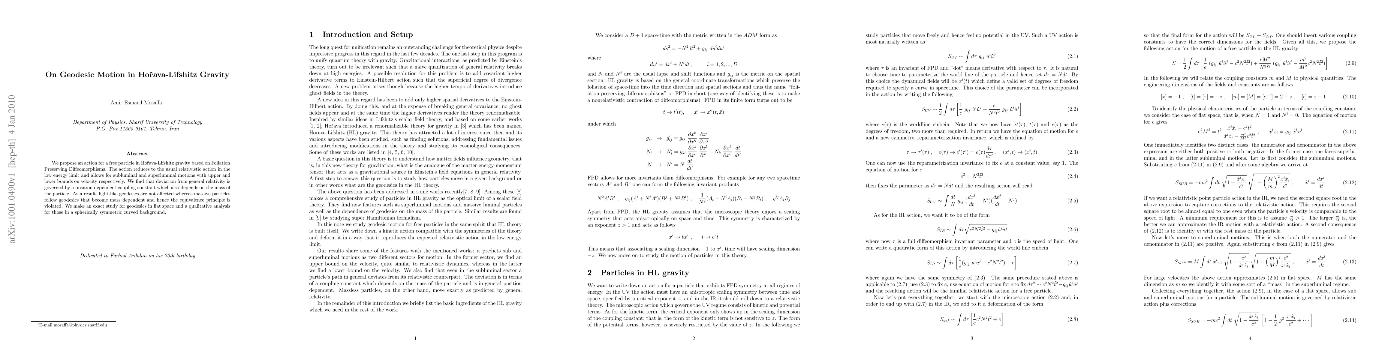 We propose an action for a free particle in Horava-Lifshitz gravity based on Foliation Preserving Diffeomorphisms. The action reduces to the usual relativistic action in the low energy limit and allows for subluminal and superluminal motions with upper and lower bounds on velocity respectively. We find that deviation from general relativity is governed by a position dependent coupling constant which also depends on the mass of the particle. As a result, light-like geodesics are not affected whereas massive particles follow geodesics that become mass dependent and hence the equivalence principle is violated. We make an exact study for geodesics in flat space and a qualitative analysis for those in a spherically symmetric curved background.