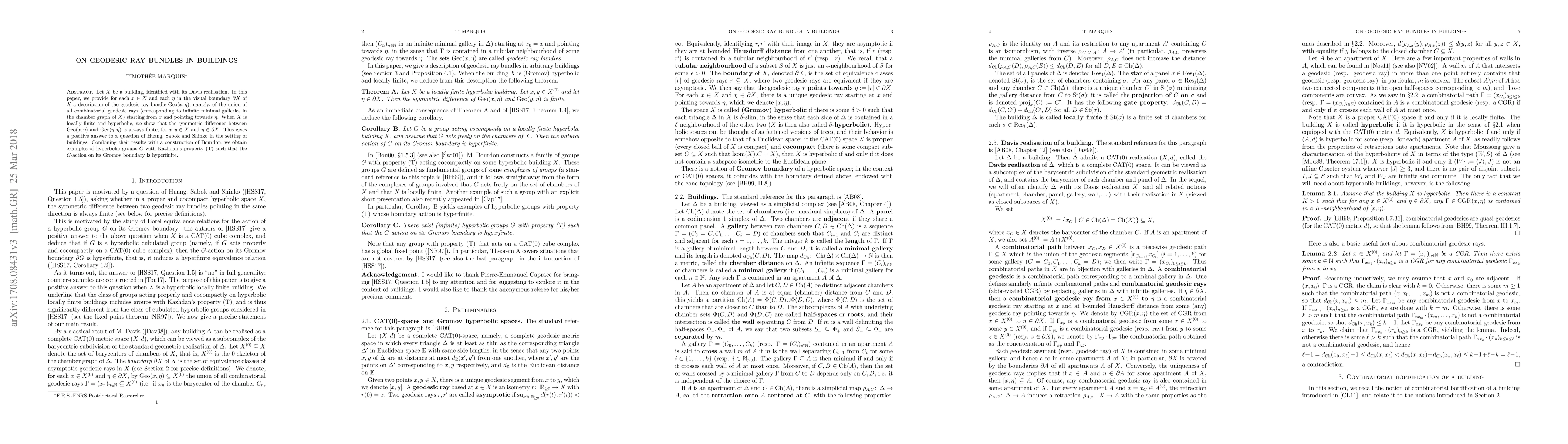 Let $X$ be a building, identified with its Davis realisation. In this paper, we provide for each $x\in X$ and each $\eta$ in the visual boundary $\partial X$ of $X$ a description of the geodesic ray bundle $Geo(x,\eta)$, namely, of the reunion of all combinatorial geodesic rays (corresponding to infinite minimal galleries in the chamber graph of $X$) starting from $x$ and pointing towards $\eta$. When $X$ is locally finite and hyperbolic, we show that the symmetric difference between $Geo(x,\eta)$ and $Geo(y,\eta)$ is always finite, for $x,y\in X$ and $\eta\in\partial X$. This gives a positive answer to a question of Huang, Sabok and Shinko in the setting of buildings. Combining their results with a construction of Bourdon, we obtain examples of hyperbolic groups $G$ with Kazhdan's property (T) such that the $G$-action on its Gromov boundary is hyperfinite.
