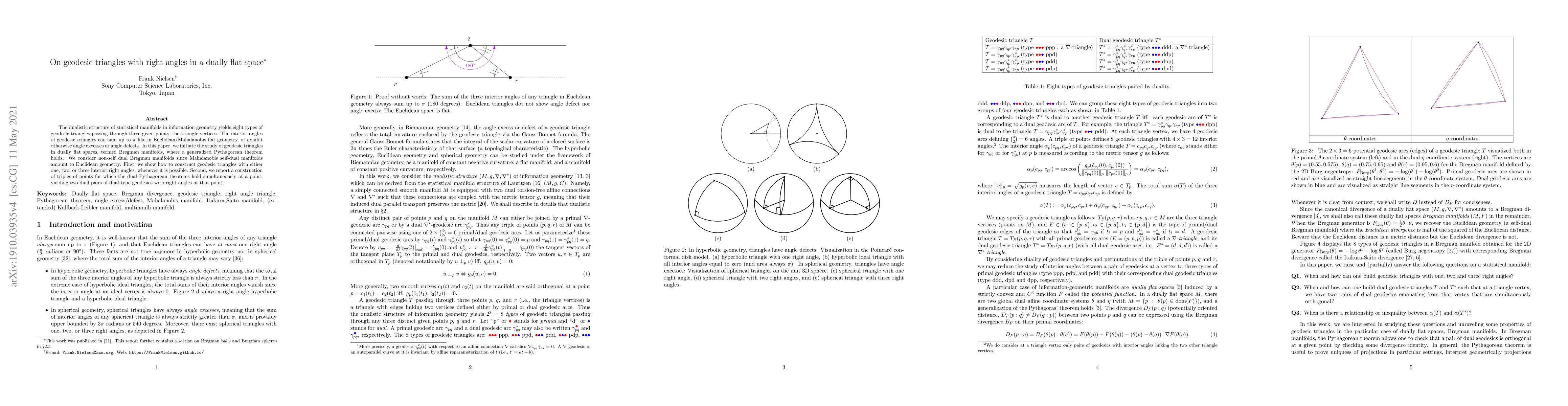 This paper explores geodesic triangles with right angles in dually flat spaces, specifically Bregman manifolds, where a generalized Pythagorean theorem applies. It constructs geodesic triangles with one, two, or three right angles, and identifies triples of points where dual Pythagorean theorems hold simultaneously.