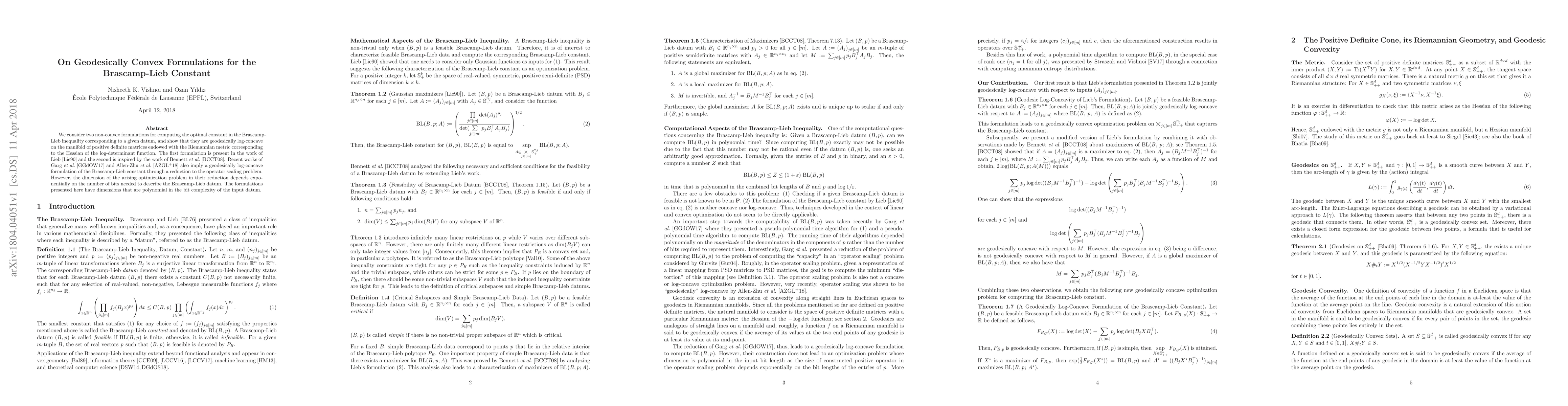 We consider two non-convex formulations for computing the optimal constant in the Brascamp-Lieb inequality corresponding to a given datum, and show that they are geodesically log-concave on the manifold of positive definite matrices endowed with the Riemannian metric corresponding to the Hessian of the log-determinant function. The first formulation is present in the work of Lieb and the second is inspired by the work of Bennett et al. Recent works of Garg et al.and Allen-Zhu et al. also imply a geodesically log-concave formulation of the Brascamp-Lieb constant through a reduction to the operator scaling problem. However, the dimension of the arising optimization problem in their reduction depends exponentially on the number of bits needed to describe the Brascamp-Lieb datum. The formulations presented here have dimensions that are polynomial in the bit complexity of the input datum.
