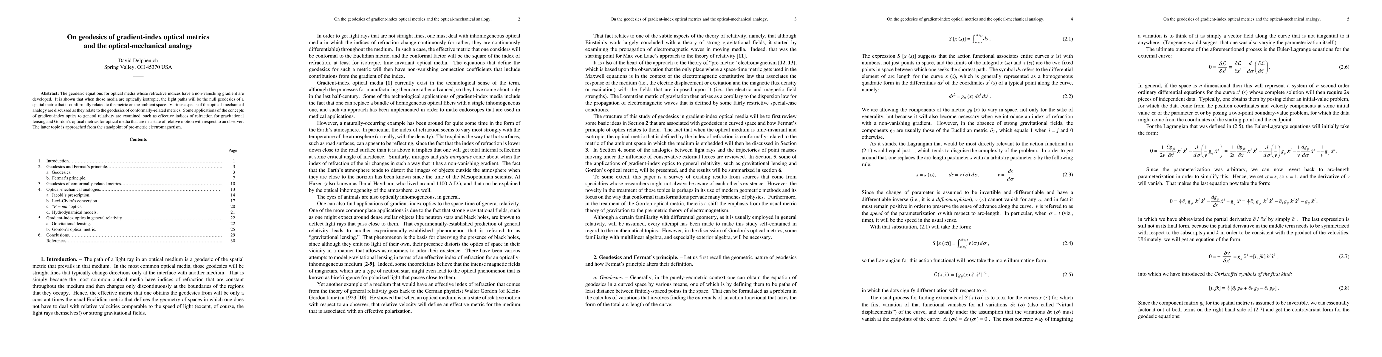 Researchers developed geodesic equations for gradient-index optical media, showing that light paths follow mull geodesics of a spatial metric conformally related to ambient space, with applications in gravitational lensing and electromagnetism.