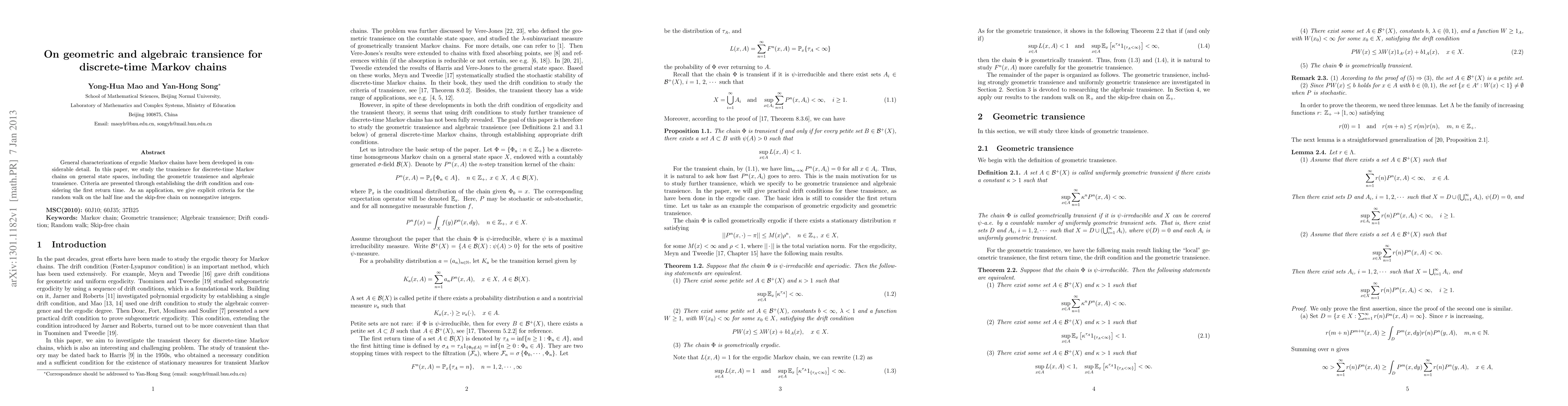 This paper characterizes geometric and algebraic transience in discrete-time Markov chains by establishing criteria based on drift conditions and first return times. It provides explicit criteria for random walk on the half line and skip-free chain on nonnegative integers.