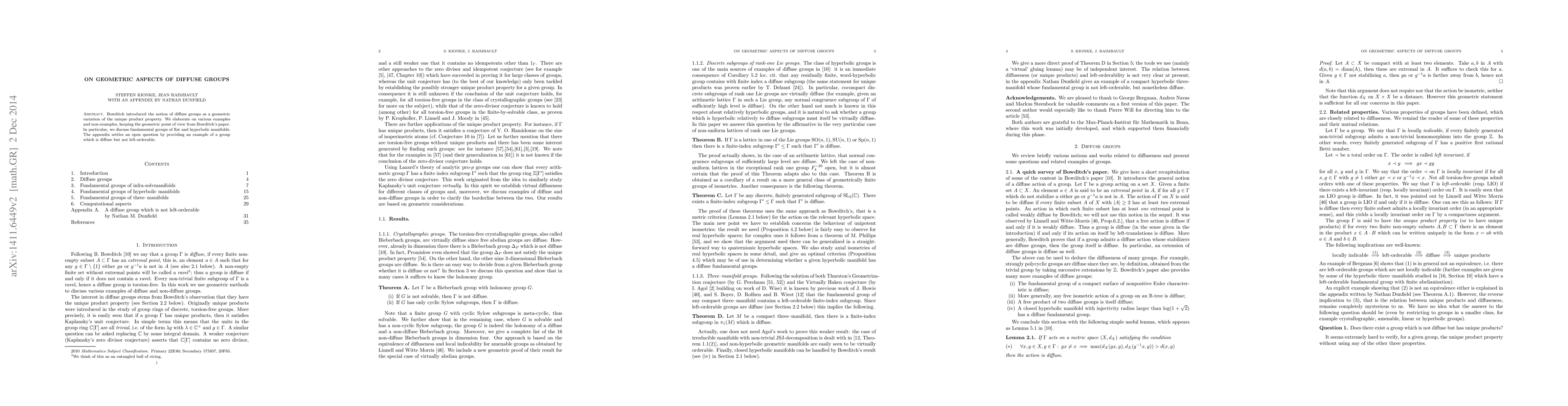Bowditch introduced the notion of diffuse groups as a geometric variation of the unique product property. We elaborate on various examples and non-examples, keeping the geometric point of view from Bowditch's paper. In particular, we discuss fundamental groups of flat and hyperbolic manifolds. The appendix settles an open question by providing an example of a group which is diffuse but not left-orderable.