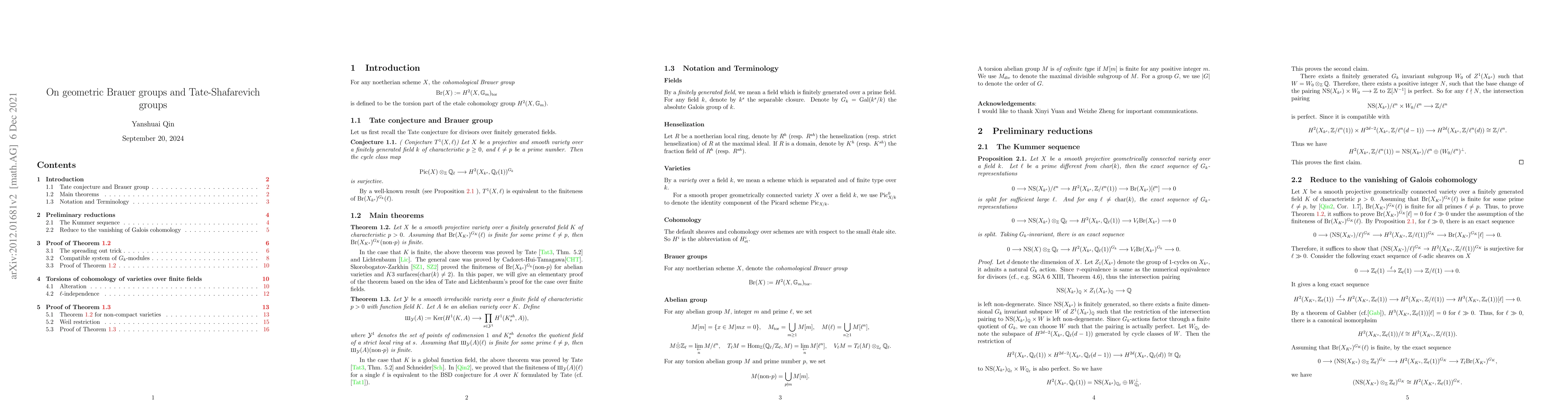 Let $X$ be a smooth projective variety over a finitely generated field $K$ of characteristic $p>0$. We proved that the finiteness of the $\ell$-primary part of $\mathrm{Br}(X_{K^s})^{G_K}$ for a single prime $\ell\neq p$ will imply the finiteness of the prime-to-$p$ part of $\mathrm{Br}(X_{K^s})^{G_K}$, generalizing a theorem of Tate and Lichtenbaum for varieties over finite fields. For an abelian variety $A$ over $K$, we proved a similar result for the Tate-Shafarevich group of $A$, generalizing a theorem of Schneider for abelian varieties over global function fields.