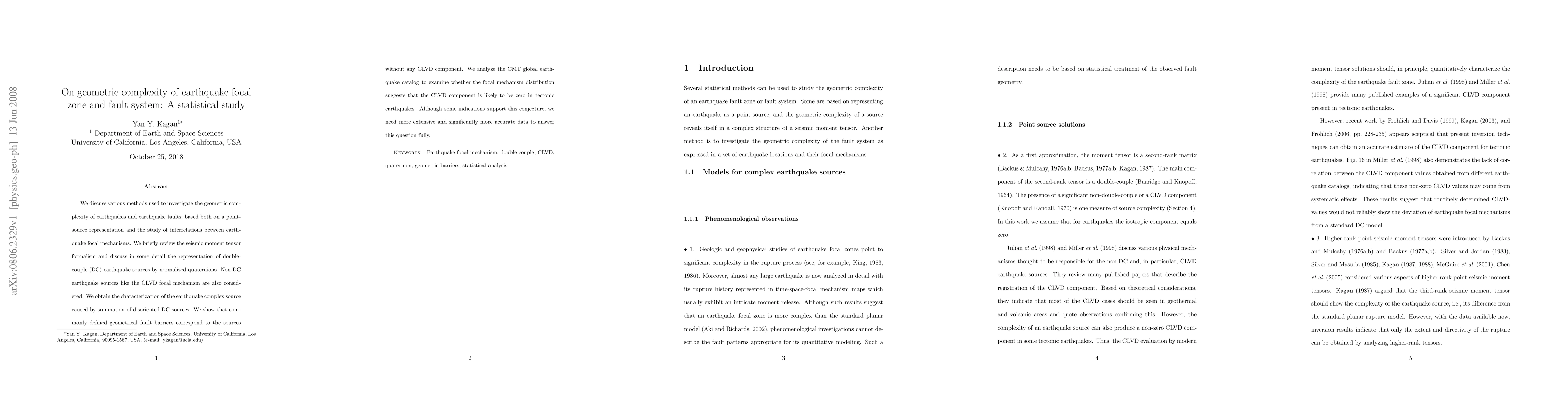 This paper investigates the geometric complexity of earthquake focal zones and fault systems using statistical methods, examining both point-source representations and interrelations between focal mechanisms. It explores the representation of double-couple sources via normalized quaternions and considers non-double-couple sources, concluding that while some evidence suggests a lack of CLVD components in tectonic earthquakes, more precise data is needed for definitive conclusions.