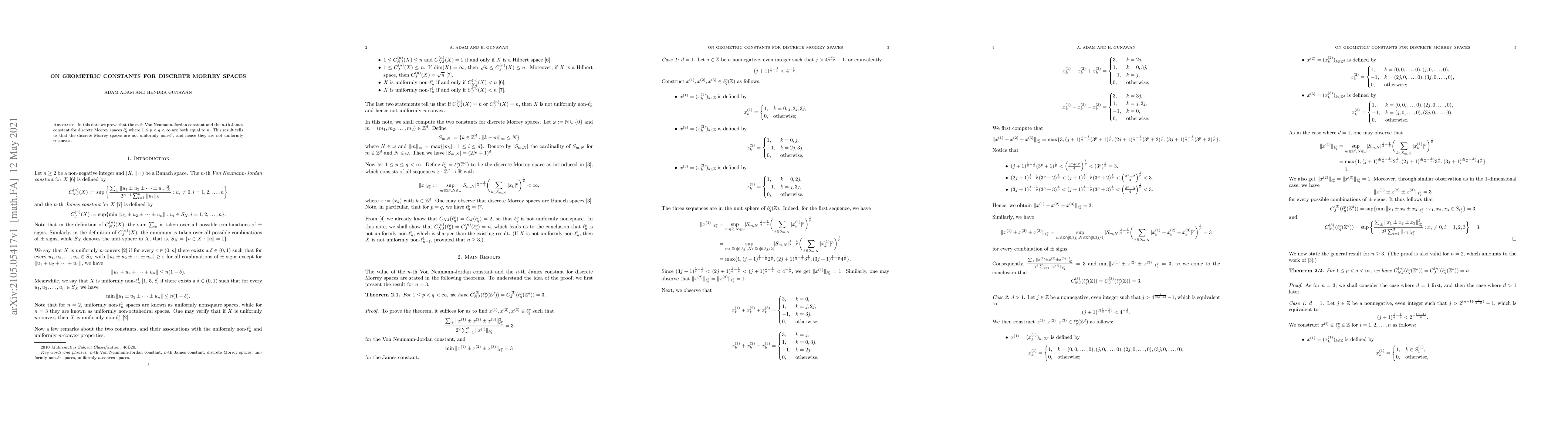 This paper proves that the $n$-th Von Neumann-Jordan constant and the $n$-th James constant for discrete Morrey spaces $\ell^p_q$ are both equal to $n$, indicating these spaces are not uniformly non-$\ell^1$ and thus not uniformly $n$-convex.