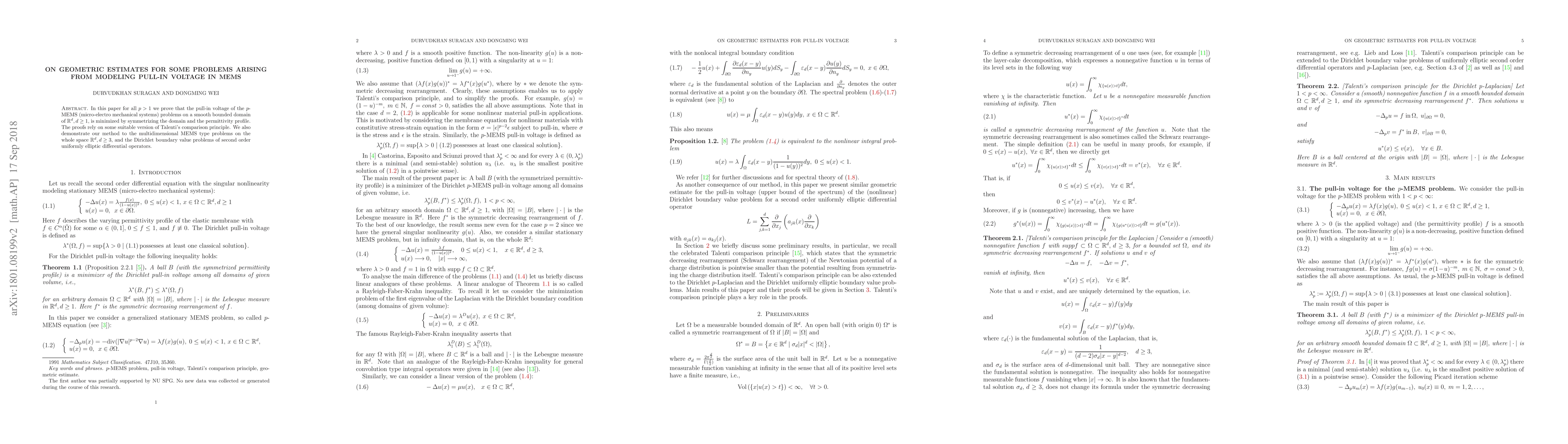 In this paper for all $p>1$ we prove that the pull-in voltage of the $p$-MEMS (micro-electro mechanical systems) problems on a smooth bounded domain of $\mathbb R^{d}, d\geq1,$ is minimized by symmetrizing the domain and the permittivity profile. The proofs rely on some suitable version of Talenti's comparison principle. We also demonstrate our method to the multidimensional MEMS type problems on the whole space $\mathbb R^{d}, d\geq3,$ and the Dirichlet boundary value problems of second order uniformly elliptic differential operators.
