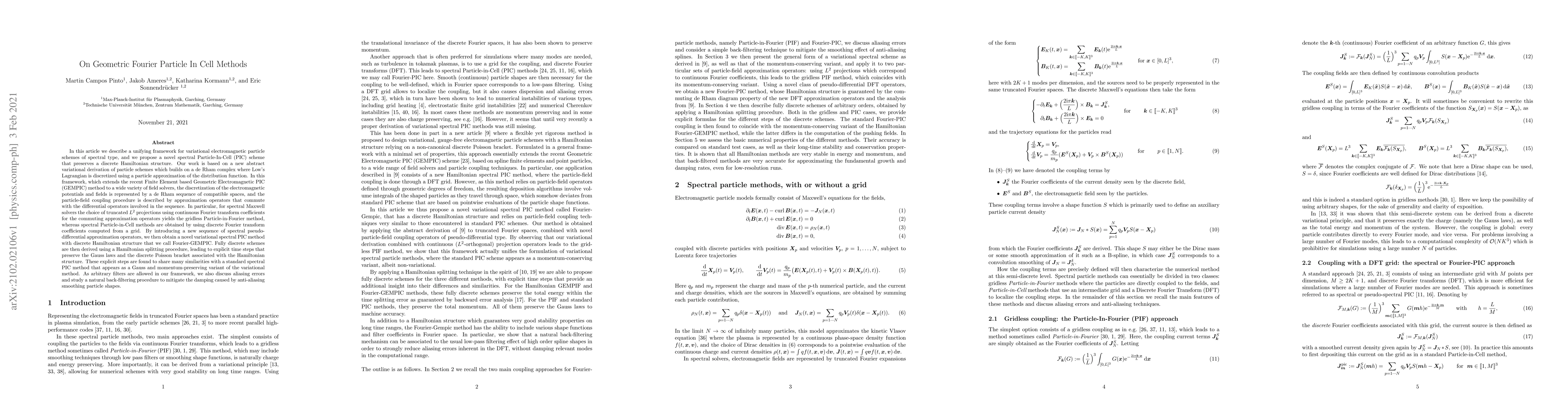 In this article we describe a unifying framework for variational electromagnetic particle schemes of spectral type, and we propose a novel spectral Particle-In-Cell (PIC) scheme that preserves a discrete Hamiltonian structure. Our work is based on a new abstract variational derivation of particle schemes which builds on a de Rham complex where Low's Lagrangian is discretized using a particle approximation of the distribution function. In this framework, which extends the recent Finite Element based Geometric Electromagnetic PIC (GEMPIC) method to a variety of field solvers, the discretization of the electromagnetic potentials and fields is represented by a de Rham sequence of compatible spaces, and the particle-field coupling procedure is described by approximation operators that commute with the differential operators in the sequence. In particular, for spectral Maxwell solvers the choice of truncated $L^2$ projections using continuous Fourier transform coefficients for the commuting approximation operators yields the gridless Particle-in-Fourier method, whereas spectral Particle-in-Cell methods are obtained by using discrete Fourier transform coefficients computed from a grid. By introducing a new sequence of spectral pseudo-differential approximation operators, we then obtain a novel variational spectral PIC method with discrete Hamiltonian structure that we call Fourier-GEMPIC. Fully discrete schemes are then derived using a Hamiltonian splitting procedure, leading to explicit time steps that preserve the Gauss laws and the discrete Poisson bracket associated with the Hamiltonian structure. These explicit steps share many similarities with standard spectral PIC methods. As arbitrary filters are allowed in our framework, we also discuss aliasing errors and study a natural back-filtering procedure to mitigate the damping caused by anti-aliasing smoothing particle shapes.