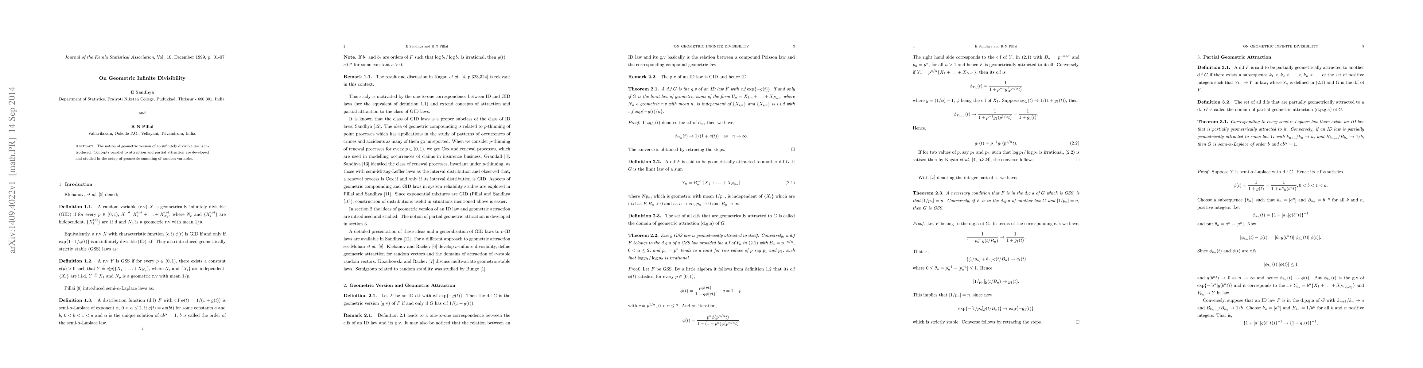 This paper introduces the geometric version of infinitely divisible laws and develops concepts parallel to attraction and partial attraction within the context of geometric summation of random variables. The study explores the properties and implications of these newly defined concepts.