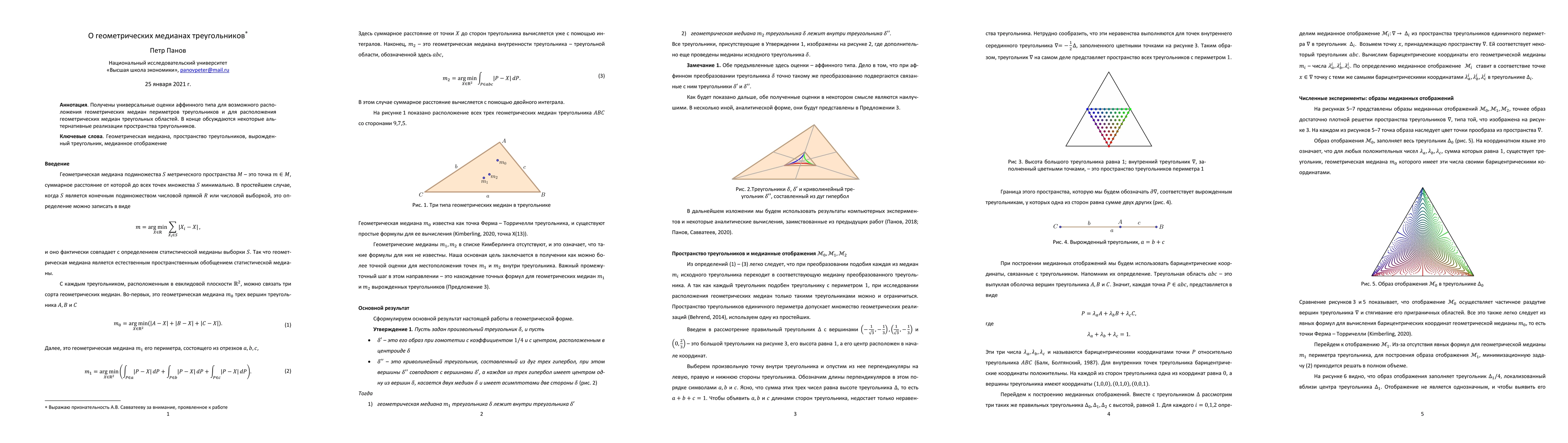 We obtain universal affine type estimates for the location of the geometric medians of triangle perimeters and for the location of the geometric medians of triangular domains. At the end, some alternative implementations of the triangle space are discussed.