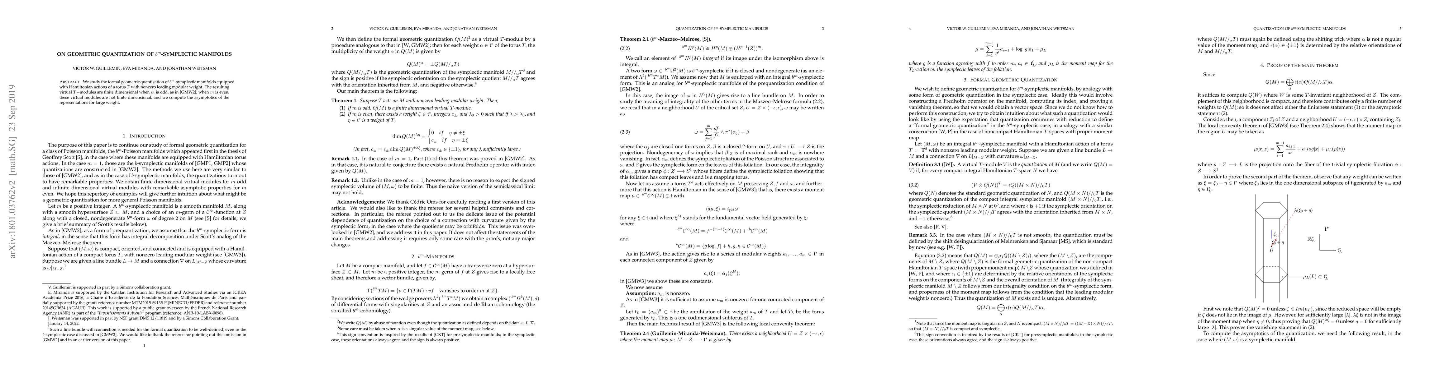 We study the formal geometric quantization of $b^m$-symplectic manifolds equipped with Hamiltonian actions of a torus $T$ with nonzero leading modular weight. The resulting virtual $T$-modules are finite dimensional when $m$ is odd, as in [GMW2]; when $m$ is even, these virtual modules are not finite dimensional, and we compute the asymptotics of the representations for large weight.