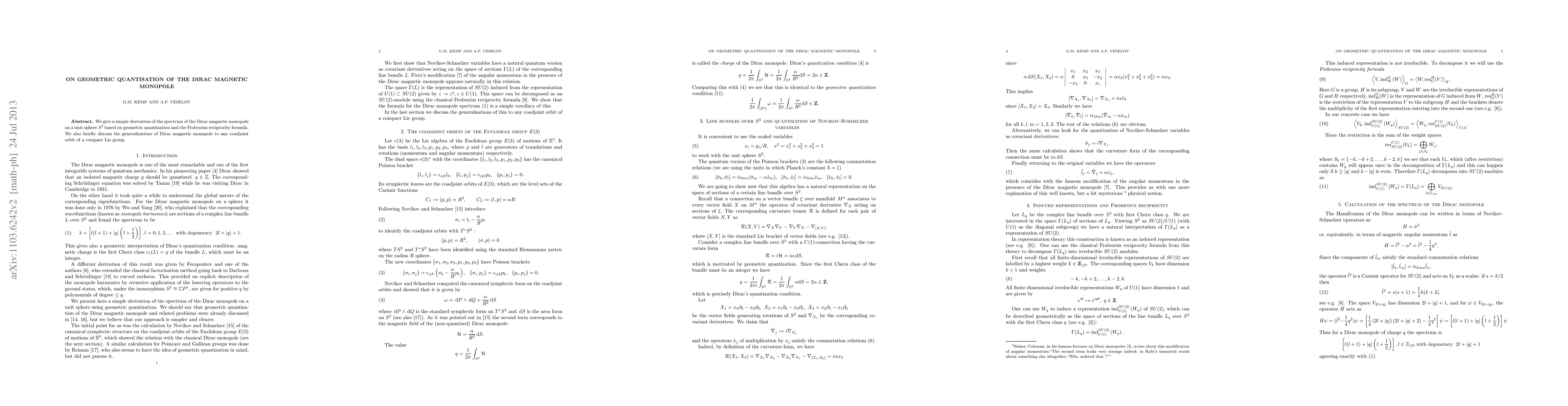 This paper derives the spectrum of the Dirac magnetic monopole on a unit sphere using geometric quantization and Frobenius reciprocity. It also explores generalizing the monopole to any coadjoint orbit of a compact Lie group.
