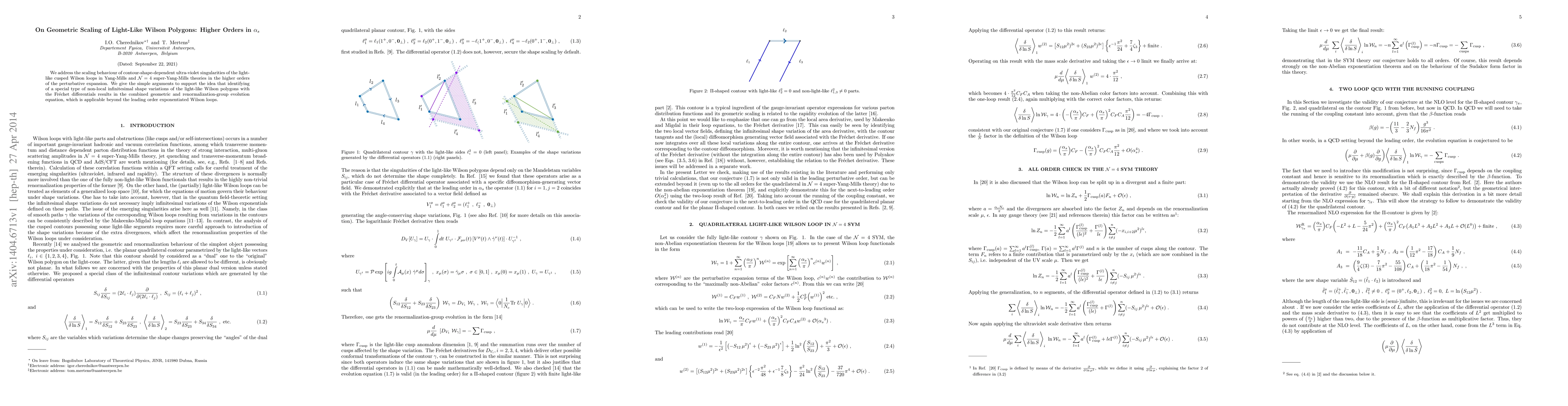 We address the scaling behaviour of contour-shape-dependent ultra-violet singularities of the light-like cusped Wilson loops in Yang-Mills and ${\cal N} = 4$ super-Yang-Mills theories in the higher orders of the perturbative expansion. We give the simple arguments to support the idea that identifying of a special type of non-local infinitesimal shape variations of the light-like Wilson polygons with the Fr\'echet differentials results in the combined geometric and renormalization-group evolution equation, which is applicable beyond the leading order exponentiated Wilson loops.