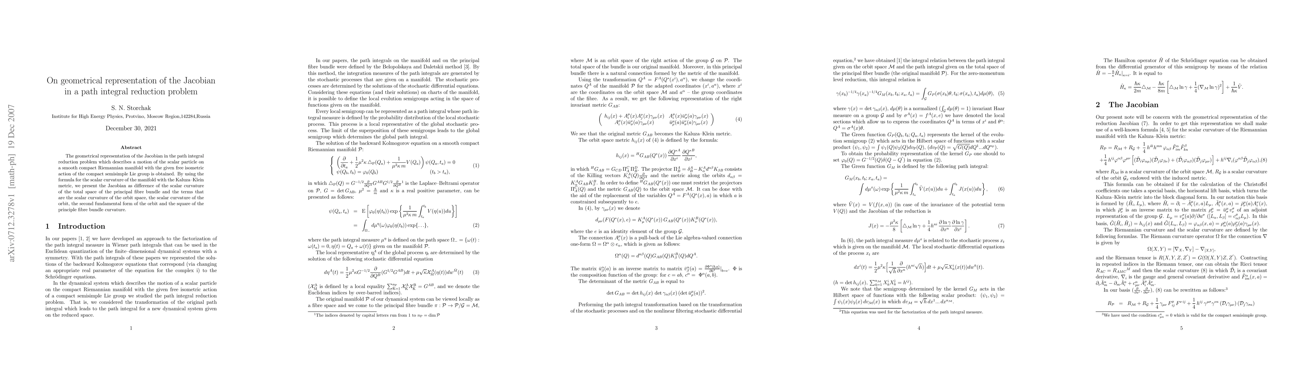 The geometrical representation of the Jacobian in the path integral reduction problem which describes a motion of the scalar particle on a smooth compact Riemannian manifold with the given free isometric action of the compact semisimple Lie group is obtained. By using the formula for the scalar curvature of the manifold with the Kaluza--Klein metric, we present the Jacobian as difference of the scalar curvature of the total space of the principal fibre bundle and the terms that are the scalar curvature of the orbit space, the scalar curvature of the orbit, the second fundamental form of the orbit and the square of the principle fibre bundle curvature.