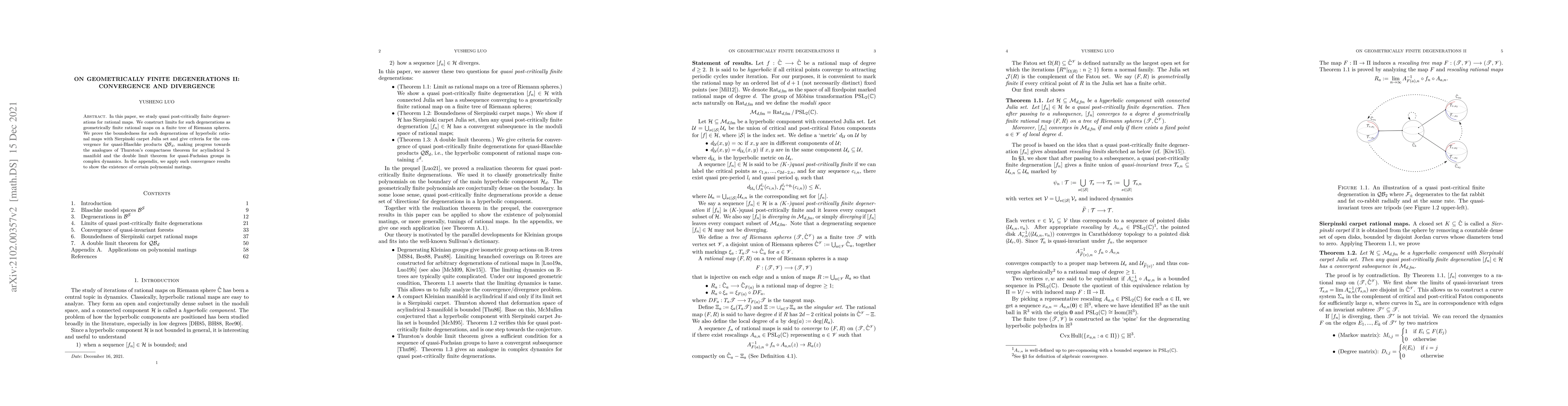 In this paper, we study quasi post-critically finite degenerations for rational maps. We construct limits for such degenerations as geometrically finite rational maps on a finite tree of Riemann spheres. We prove the boundedness for such degenerations of hyperbolic rational maps with Sierpinski carpet Julia set and give criteria for the convergence for quasi-Blaschke products $\mathcal{QB}_d$, making progress towards the analogues of Thurston's compactness theorem for acylindrical $3$-manifold and the double limit theorem for quasi-Fuchsian groups in complex dynamics. In the appendix, we apply such convergence results to show the existence of certain polynomial matings.