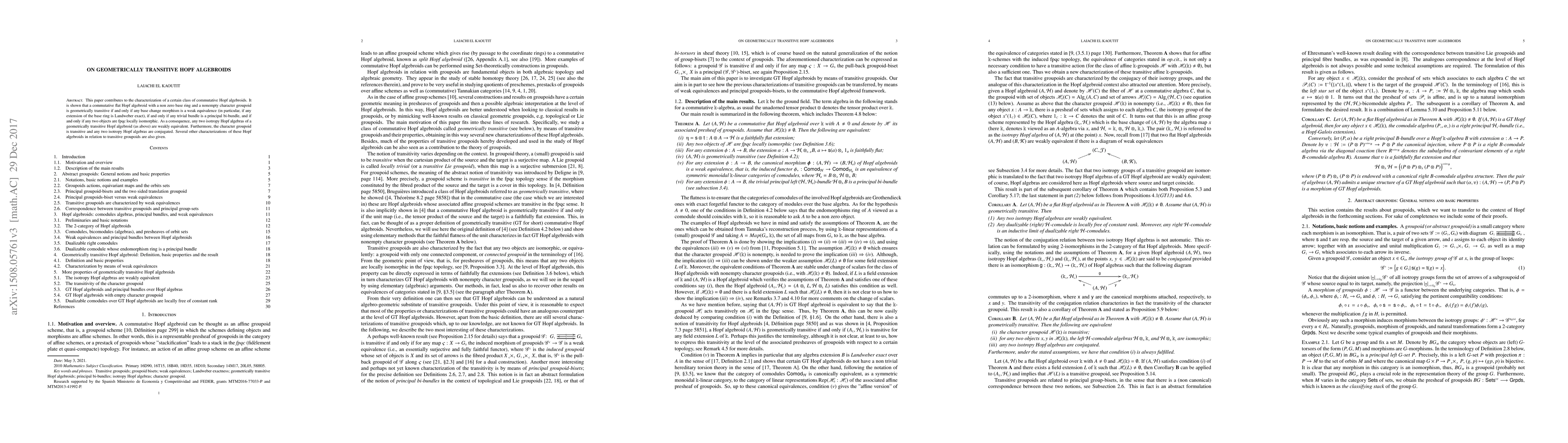This paper characterizes geometrically transitive commutative flat Hopf algebroids, proving they are equivalent to several properties including weak equivalence under base changes and fpqc local isomorphisms. It concludes that isotropy Hopf algebras are weakly equivalent and conjugated within the character groupoid.