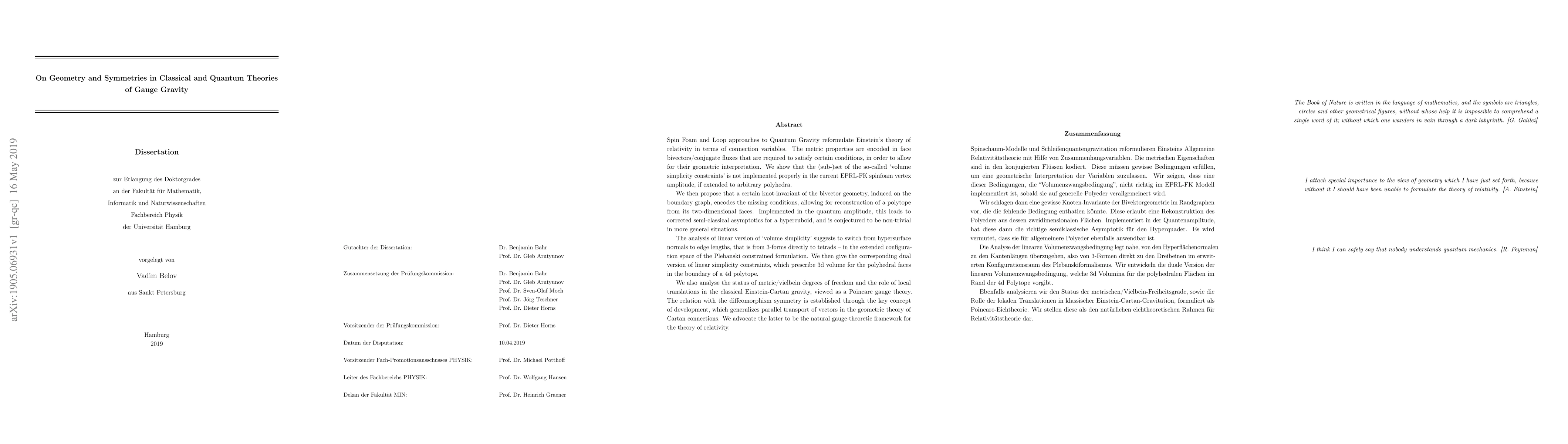 Spin Foam and Loop approaches to Quantum Gravity reformulate Einstein's theory of relativity in terms of connection variables. The metric properties are encoded in face bivectors/conjugate fluxes that are required to satisfy certain conditions, in order to allow for their geometric interpretation. We show that the (sub-)set of the so-called `volume simplicity constraints' is not implemented properly in the current EPRL-FK spinfoam vertex amplitude, if extended to arbitrary polyhedra. We then propose that a certain knot-invariant of the bivector geometry, induced on the boundary graph, encodes the missing conditions, allowing for reconstruction of a polytope from its two-dimensional faces. Implemented in the quantum amplitude, this leads to corrected semi-classical asymptotics for a hypercuboid, and is conjectured to be non-trivial in more general situations. The analysis of linear version of `volume simplicity' suggests to switch from hypersurface normals to edge lengths, that is from 3-forms directly to tetrads -- in the extended configuration space of the Plebanski constrained formulation. We then give the corresponding dual version of linear simplicity constraints, which prescribe 3d volume for the polyhedral faces in the boundary of a 4d polytope. We also analyse the status of metric/vielbein degrees of freedom and the role of local translations in the classical Einstein-Cartan gravity, viewed as a Poincare gauge theory. The relation with the diffeomorphism symmetry is established through the key concept of development, which generalizes parallel transport of vectors in the geometric theory of Cartan connections. We advocate the latter to be the natural gauge-theoretic framework for the theory of relativity.