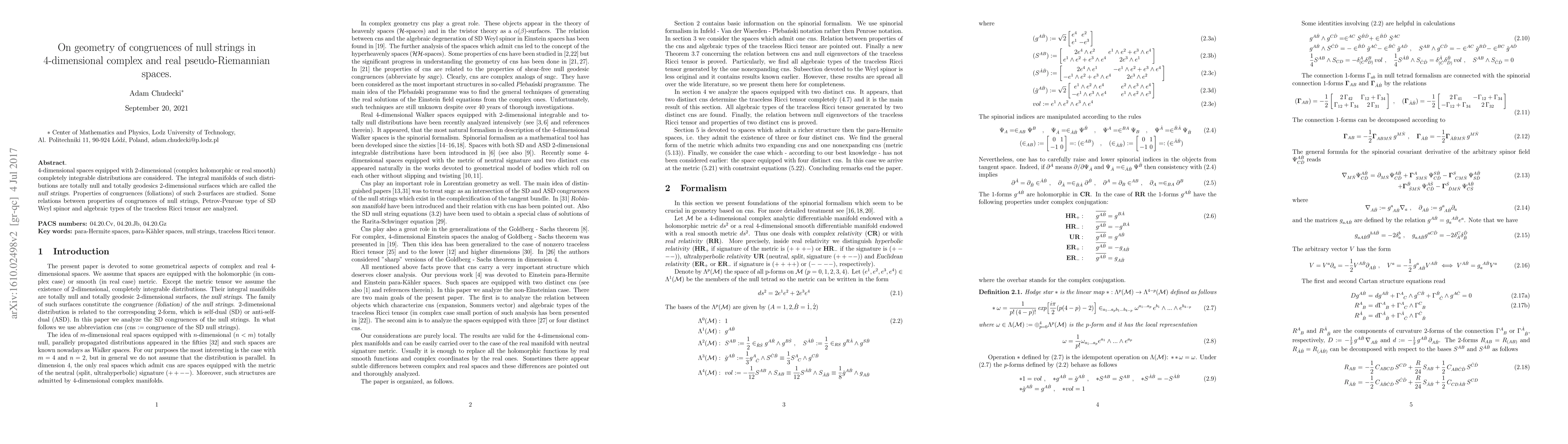 4-dimensional spaces equipped with 2-dimensional (complex holomorphic or real smooth) completely integrable distributions are considered. The integral manifolds of such distributions are totally null and totally geodesics 2-dimensional surfaces which are called the null strings. Properties of congruences (foliations) of such 2-surfaces are studied. Some relations between properties of congruences of null strings, Petrov-Penrose type of SD Weyl spinor and algebraic types of the traceless Ricci tensor are analyzed.