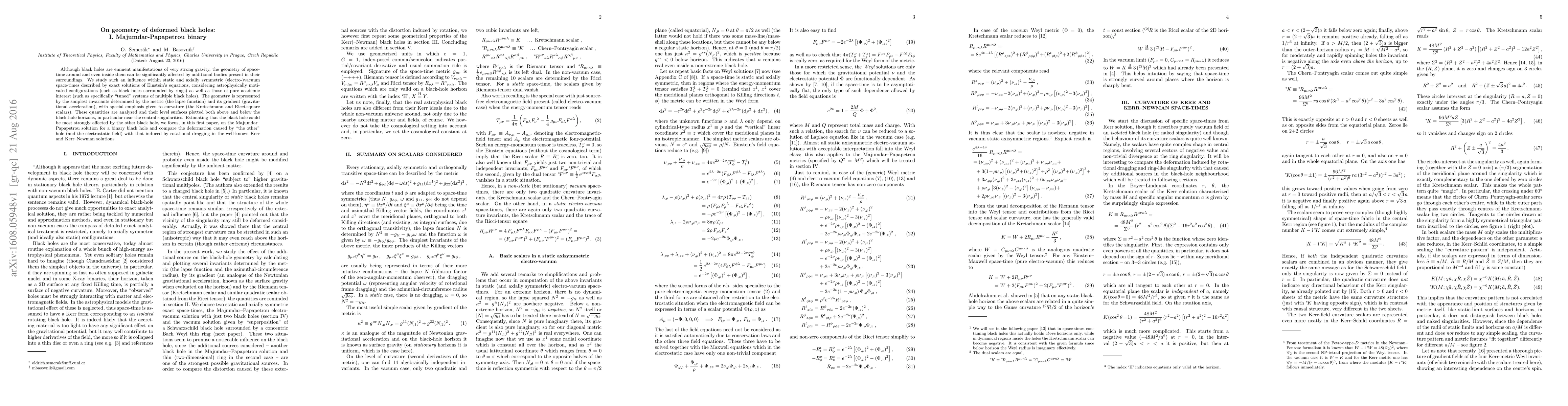 Although black holes are eminent manifestations of very strong gravity, the geometry of space-time around and even inside them can be significantly affected by additional bodies present in their surroundings. We study such an influence within static and axially symmetric (electro-)vacuum space-times described by exact solutions of Einstein's equations, considering astrophysically motivated configurations (such as black holes surrounded by rings) as well as those of pure academic interest (such as specifically "tuned" systems of multiple black holes). The geometry is represented by the simplest invariants determined by the metric (the lapse function) and its gradient (gravitational acceleration), with special emphasis given to curvature (the Kretschmann and Ricci-square scalars). These quantities are analyzed and their level surfaces plotted both above and below the black-hole horizons, in particular near the central singularities. Estimating that the black hole could be most strongly affected by the other black hole, we focus, in this first paper, on the Majumdar--Papapetrou solution for a binary black hole and compare the deformation caused by "the other" hole (and the electrostatic field) with that induced by rotational dragging in the well-known Kerr and Kerr--Newman solutions.