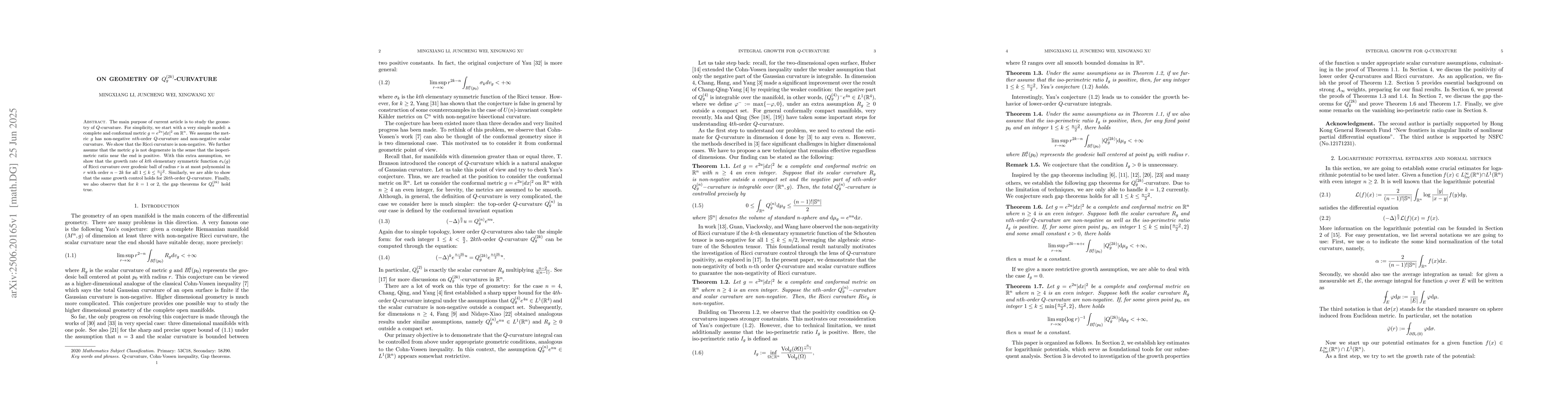 The main purpose of current article is to study the geometry of $Q$-curvature. For simplicity, we start with a very simple model: a complete and conformal metric $g=e^{2u}|dx|^2$ on $\mathbb{R}^n$. We assume the metric $g$ has non-negative $nth$-order $Q$-curvature and non-negative scalar curvature. We show that the Ricci curvature is non-negative. We further assume that the metric $g$ is not degenerate in the sense that the isoperimetric ratio near the end is positive. With this extra assumption, we show that the growth rate of $kth$ elementary symmetric function $\sigma_k(g)$ of Ricci curvature over geodesic ball of radius $r$ is at most polynomial in $r$ with order $n-2k$ for all $1 \leq k \leq \frac{n-2}{2}$. Similarly, we are able to show that the same growth control holds for $2kth$-order $Q$-curvature. Finally, we also observe that for $k=1$ or $2$, the gap theorems for $Q^{(2k)}_g$ hold true.