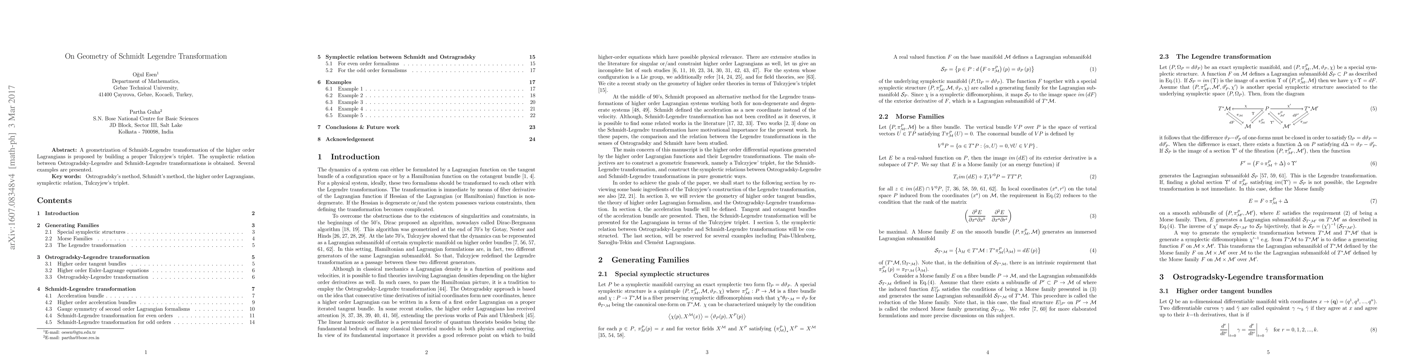 A geometrization of Schmidt-Legendre transformation of the second order Lagrangians is proposed by building a proper Tulczyjew's triplet. The symplectic relation between Ostrogradsky-Legendre and Schmidt-Legendre transformations is obtained. Several examples are presented.