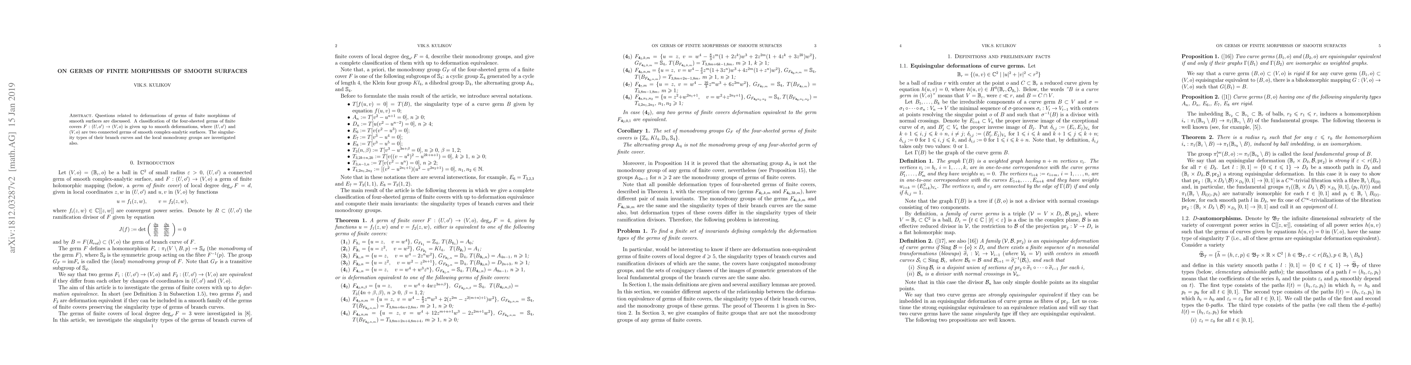 This paper classifies four-sheeted germs of finite covers of smooth surfaces up to smooth deformations, examining the singularity types of branch curves and local monodromy groups. The focus is on the intricate structure of these morphisms and their deformations.