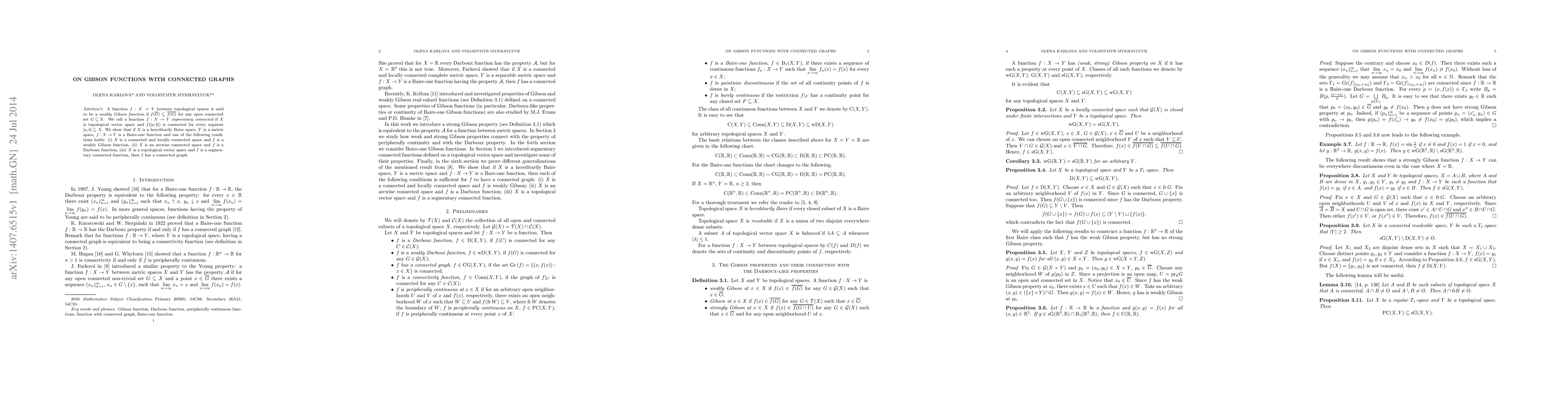A function $f:X\to Y$ between topological spaces is said to be a {\it weakly Gibson function} if $f(\overline{G})\subseteq \overline{f(G)}$ for any open connected set \mbox{$G\subseteq X$}. We call a function $f:X\to Y$ {\it segmentary connected} if $X$ is topological vector space and $f([a,b])$ is connected for every segment $[a,b]\subseteq X$. We show that if $X$ is a hereditarily Baire space, $Y$ is a metric space, \mbox{$f:X\to Y$} is a Baire-one function and one of the following conditions holds: (i) $X$ is a connected and locally connected space and $f$ is a weakly Gibson function, (ii) $X$ is an arcwise connected space and $f$ is a Darboux function, (iii) $X$ is a topological vector space and $f$ is a segmentary connected function, then $f$ has a connected graph.