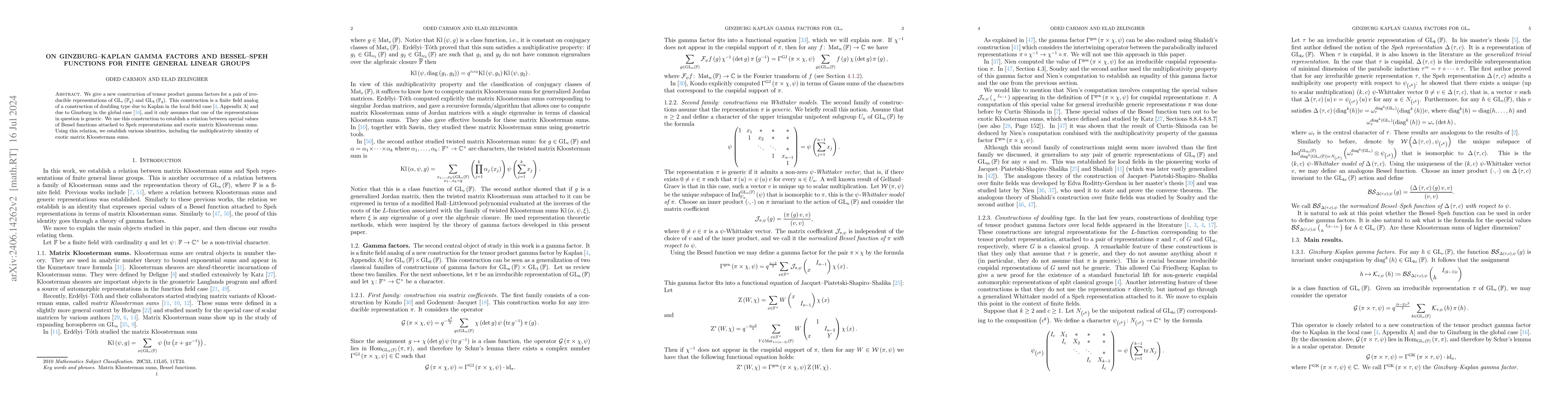 We give a new construction of tensor product gamma factors for a pair of irreducible representations of $\operatorname{GL}_c\left(\mathbb{F}_q\right)$ and $\operatorname{GL}_k\left(\mathbb{F}_q\right)$. This construction is a finite field analog of a construction of doubling type due to Kaplan in the local field case and due to Ginzburg in the global case, and it only assumes that one of the representations in question is generic. We use this construction to establish a relation between special values of Bessel functions attached to Speh representations and exotic matrix Kloosterman sums. Using this relation, we establish various identities, including the multiplicativity identity of exotic matrix Kloosterman sums.
