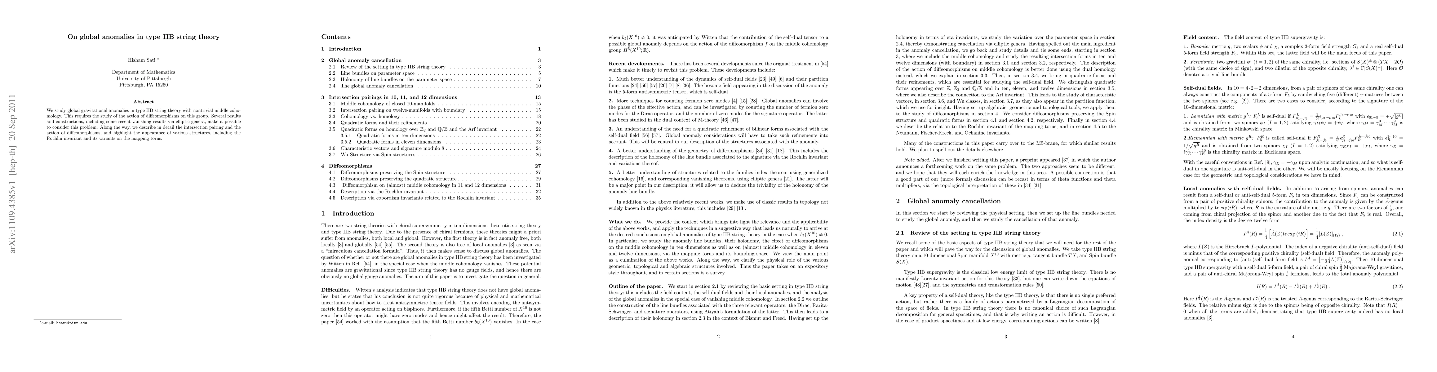 Researchers studied global gravitational anomalies in type IIB string theory, using recent results on vanishing anomalies and detailed analysis of diffeomorphism actions to understand the intersection pairing and its structures.