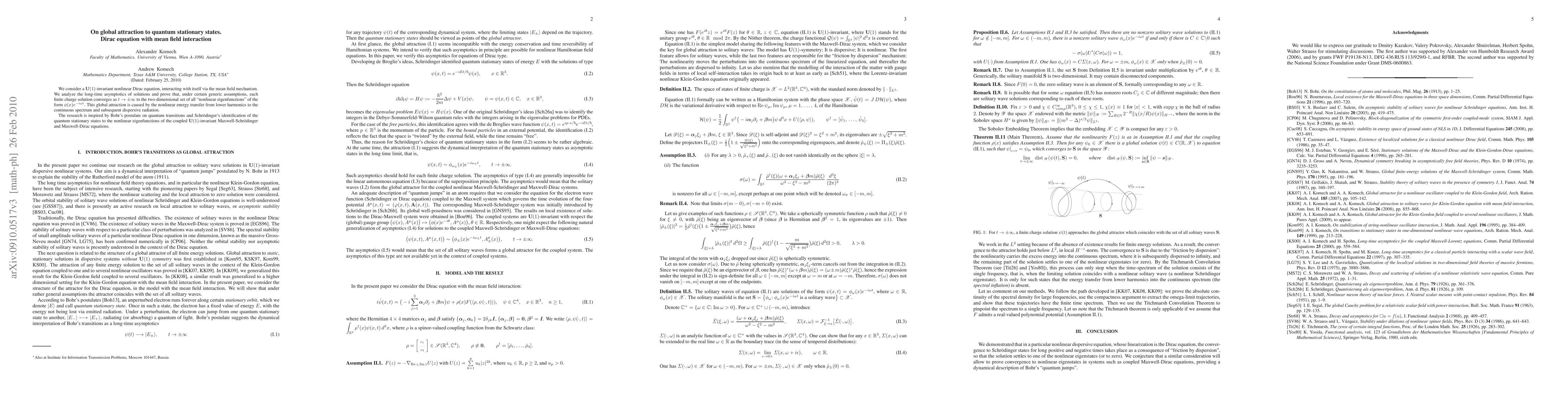 We consider a U(1)-invariant nonlinear Dirac equation in dimension $n=3$, interacting with itself via the mean field mechanism. We analyze the long-time asymptotics of solutions and prove that, under certain generic assumptions, each finite charge solution converges as $t\to\pm\infty$ to the two-dimensional set of all "nonlinear eigenfunctions" of the form $\phi(x)e\sp{-i\omega t}$. This global attraction is caused by the nonlinear energy transfer from lower harmonics to the continuous spectrum and subsequent dispersive radiation. The research is inspired by Bohr's postulate on quantum transitions and Schr\"odinger's identification of the quantum stationary states to the nonlinear eigenfunctions of the coupled U(1)-invariant Maxwell-Schr\"odinger and Maxwell-Dirac equations.