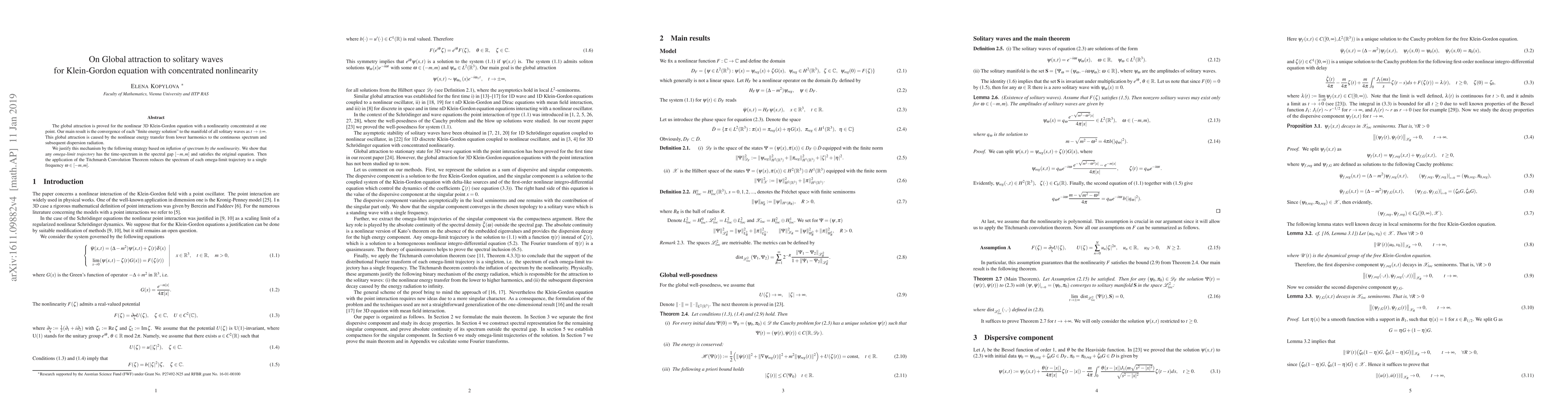 Summary: This paper proves global attraction to solitary waves for the 3D Klein-Gordon equation with concentrated nonlinearity, showing that finite energy solutions converge to solitary waves as time approaches infinity. The mechanism involves nonlinear energy transfer from lower harmonics to the continuous spectrum and dispersion radiation, justified by the inflation of spectrum and the Titchmarsh Convolution Theorem.