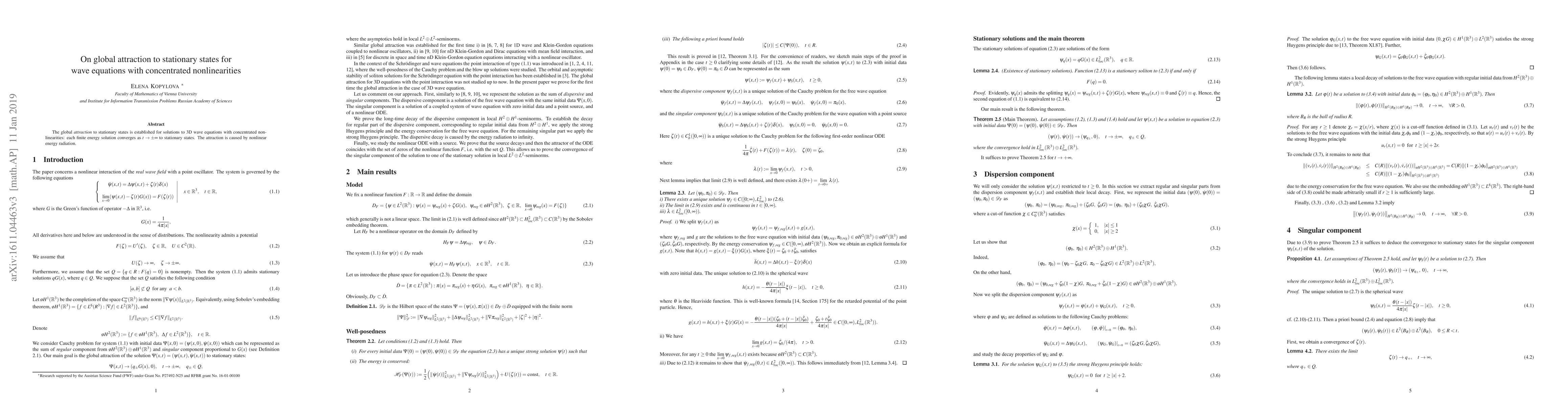 Summary: This paper proves global attraction to stationary states for 3D wave equations with concentrated nonlinearities, demonstrating that finite energy solutions converge to these states as time approaches infinity, driven by nonlinear energy radiation.